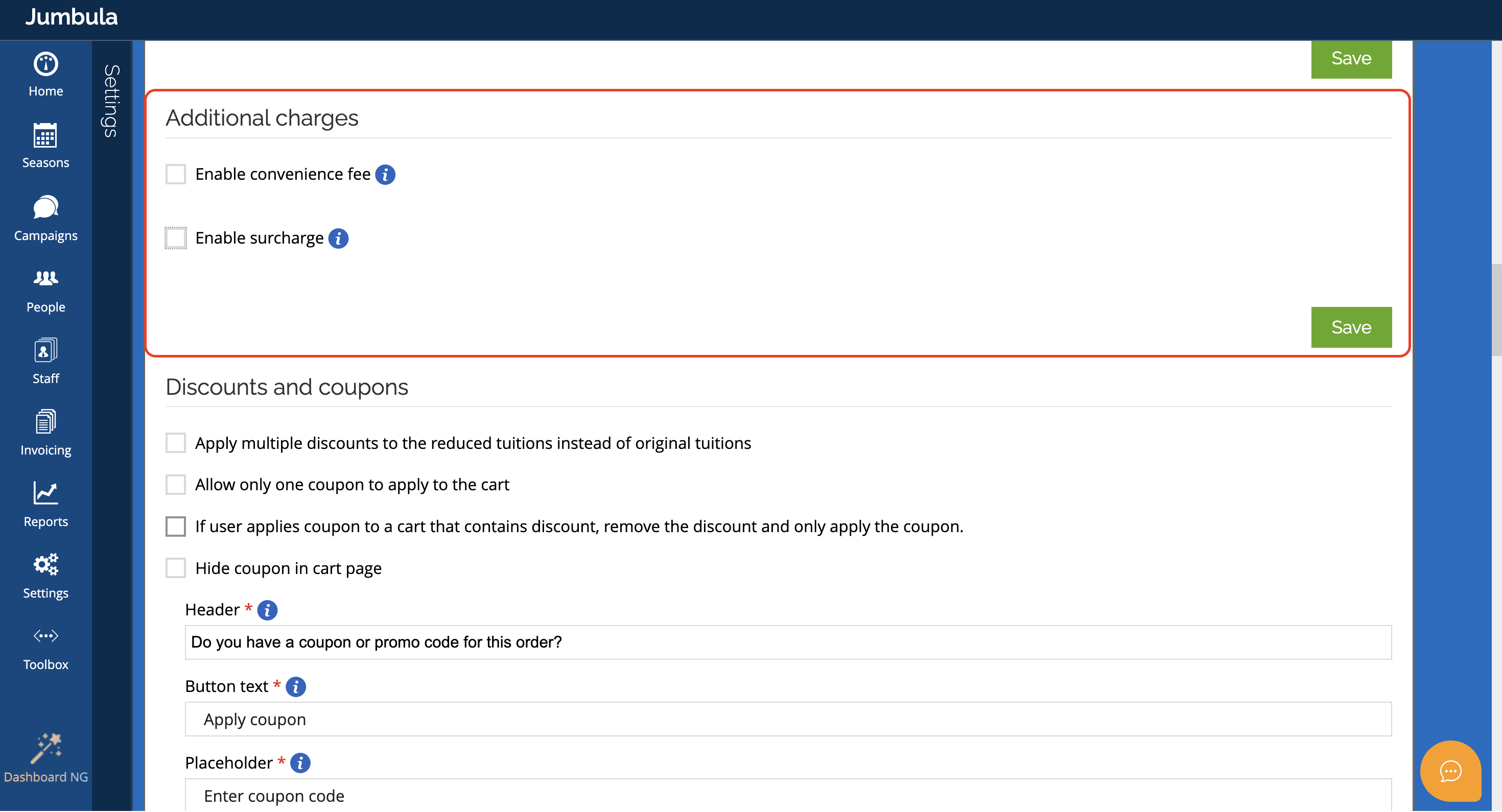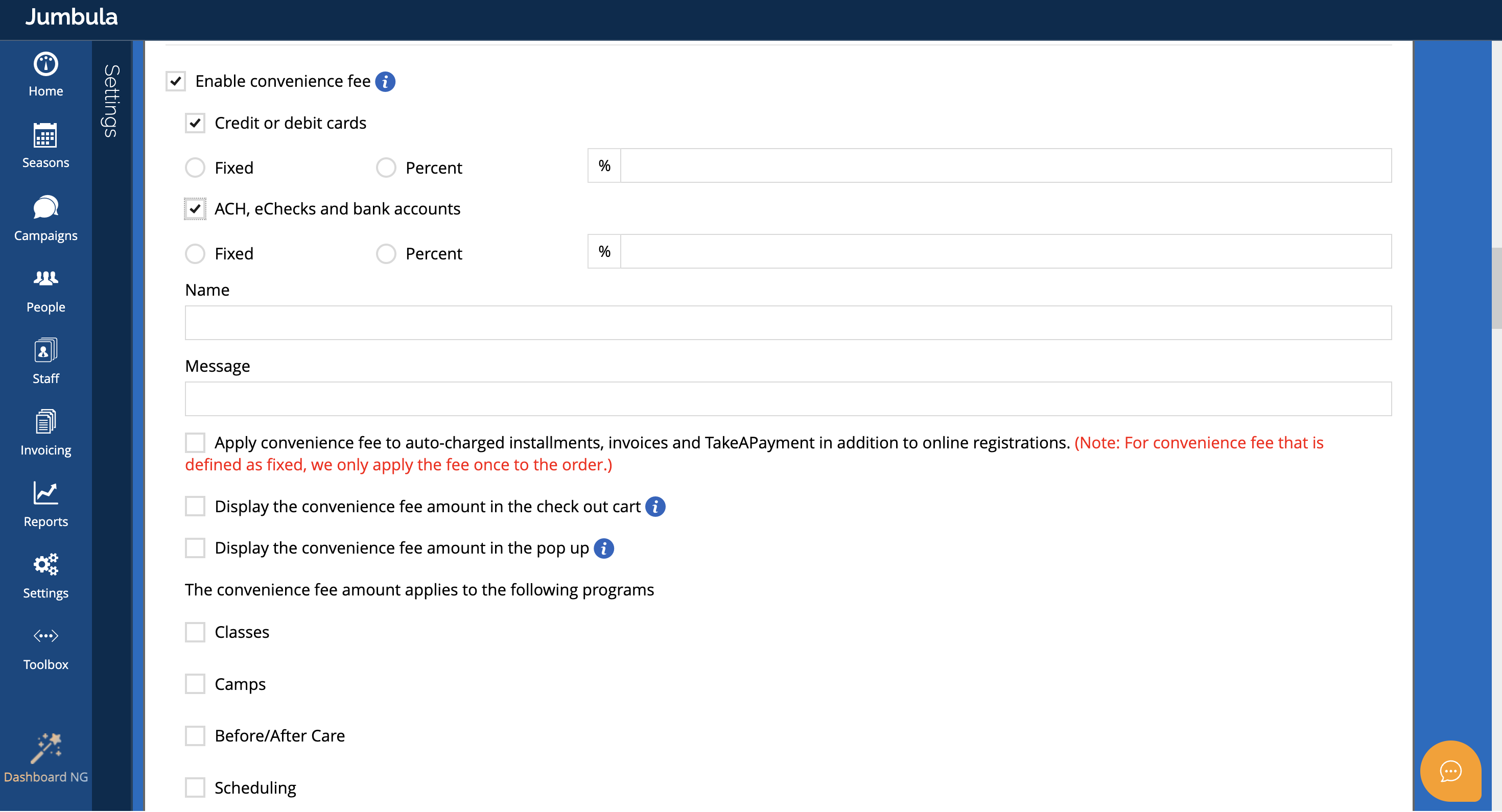 In Jumbula, convenience fees and surcharges both add costs to the base program price, but they serve different purposes and apply under different conditions. Understanding the difference helps with accurate billing and clear communication with families.