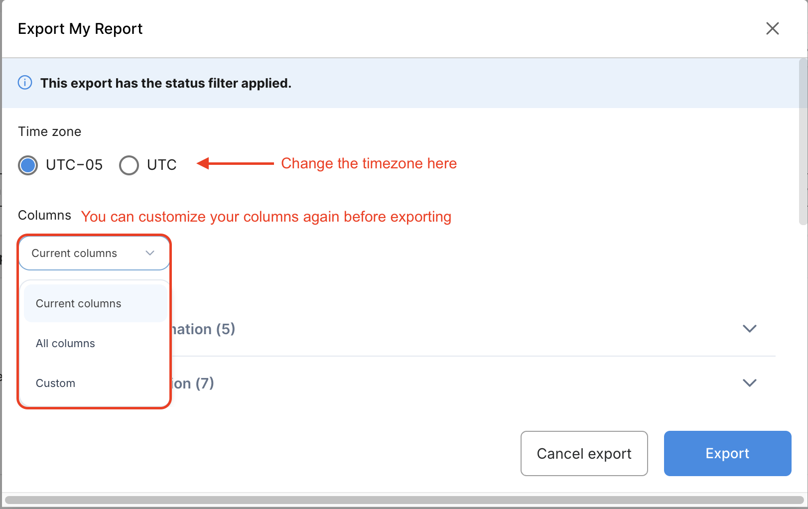 To export report data, click Export to Excel and follow the steps shown below. Before exporting, you can adjust the timezone and select which columns to include. Click Export to download your file.