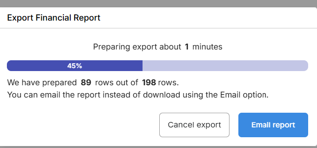 You can email the Excel file directly from your dashboard. To do this, while the file is being exported, click Email report. Fill out the form and click Send. The email will be delivered automatically once the exported Excel file is ready.