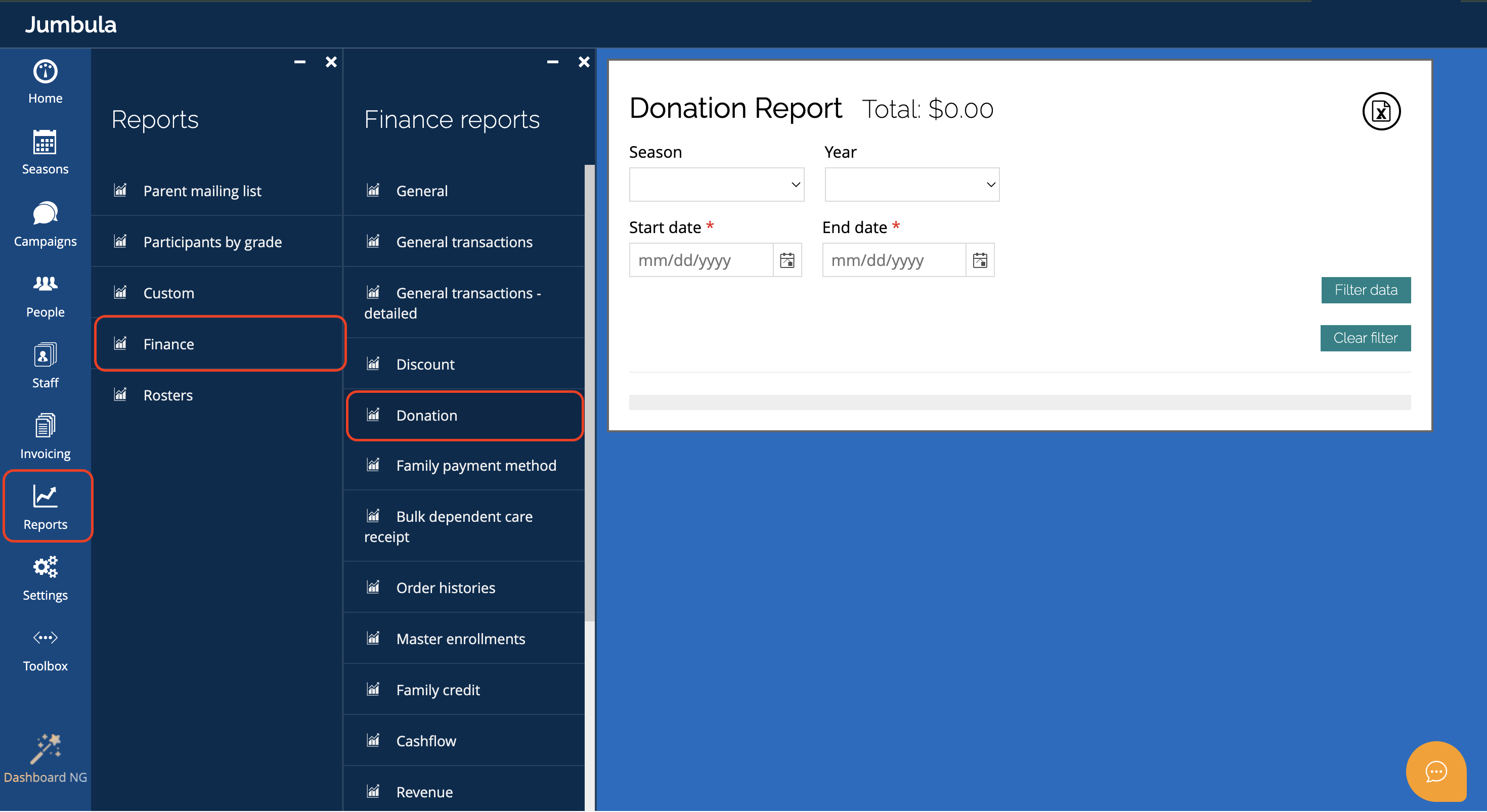 Tracking contributions is essential for organizations that accept philanthropic support alongside their program registrations. Jumbula provides a dedicated Donation Report that allows you to monitor all incoming donations within a specific timeframe. This report provides a clear view of individual contributions and calculates your total funds raised, helping you stay organized.