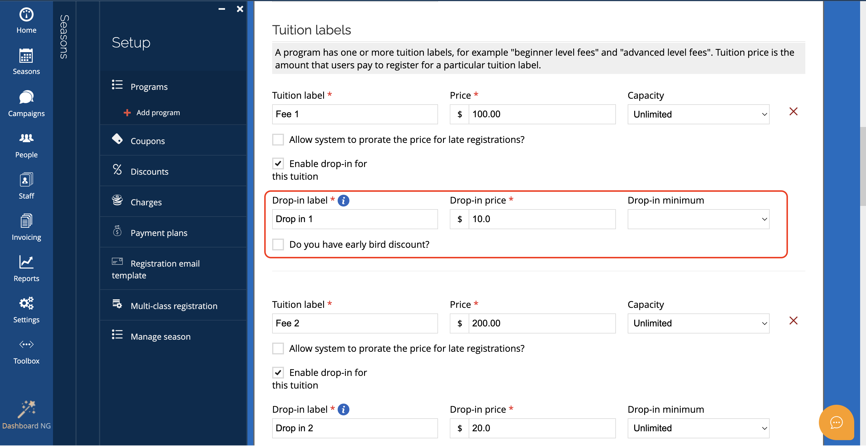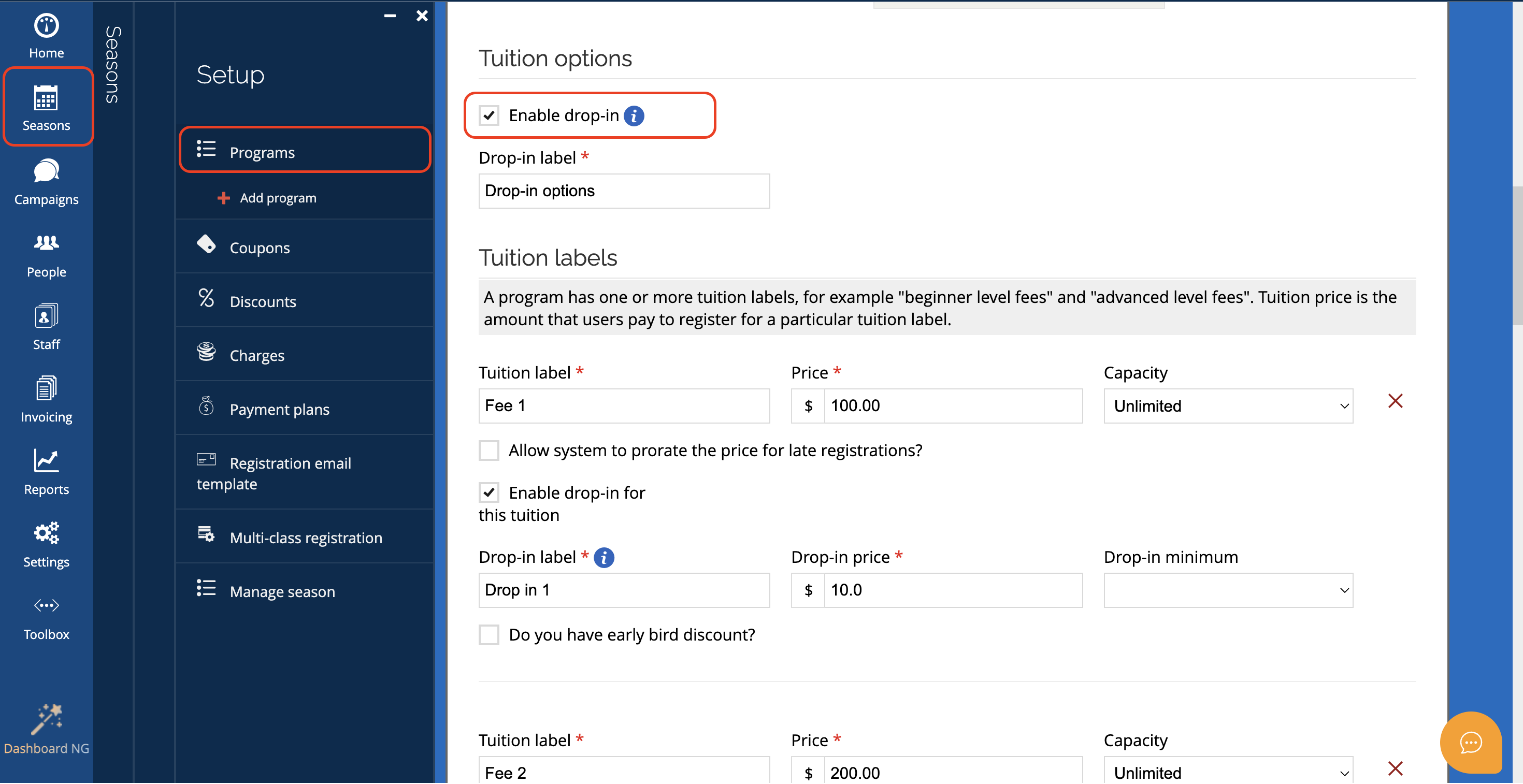 Then, in the Tuition Labels section, you can enable Drop-in for each tuition label in case you have more than one.