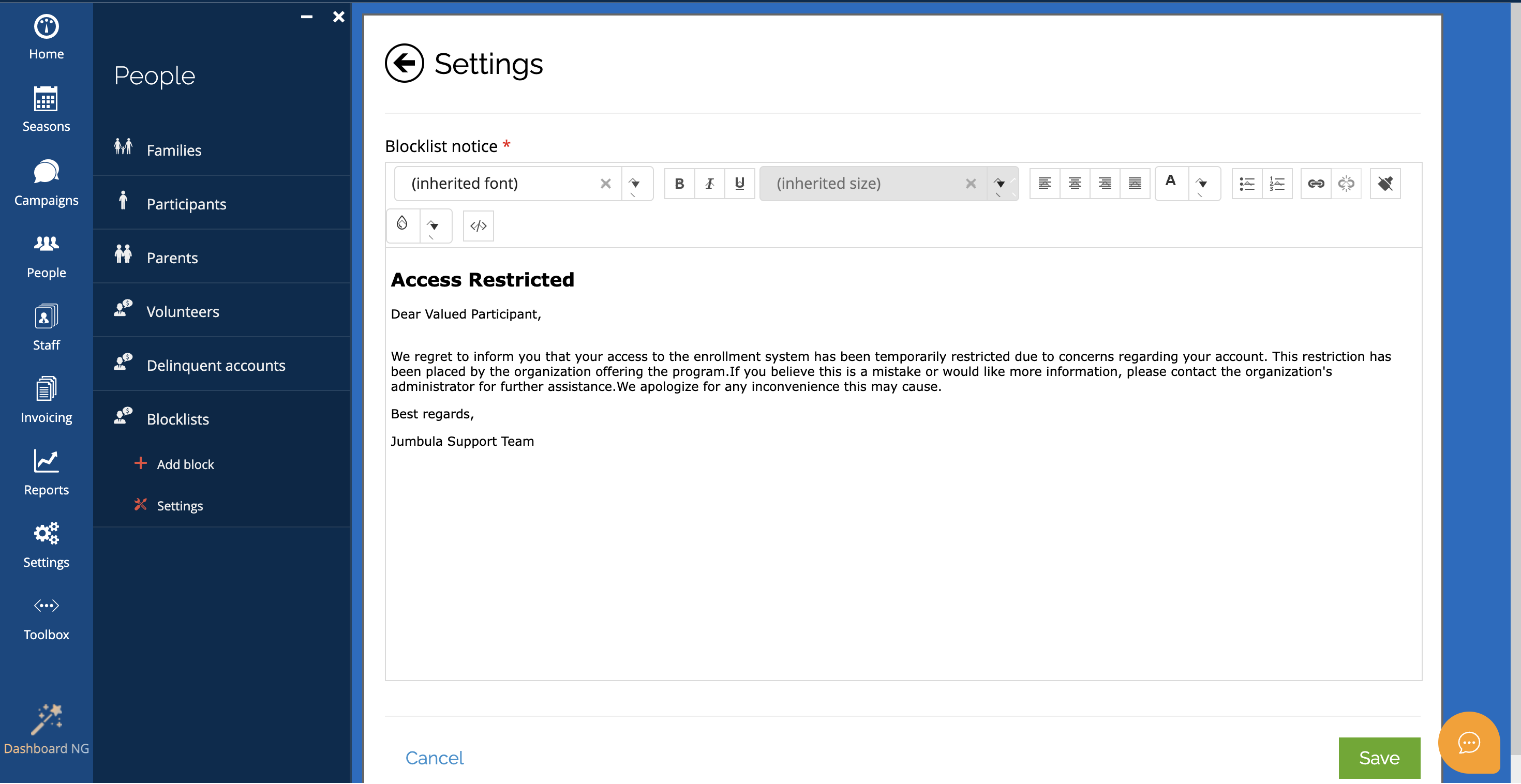 Overview The Blocklist feature allows organizations to restrict certain users from registration for classes. You can use this feature to block families and participants from registering for your programs, for example, a family that is delinquent and ...