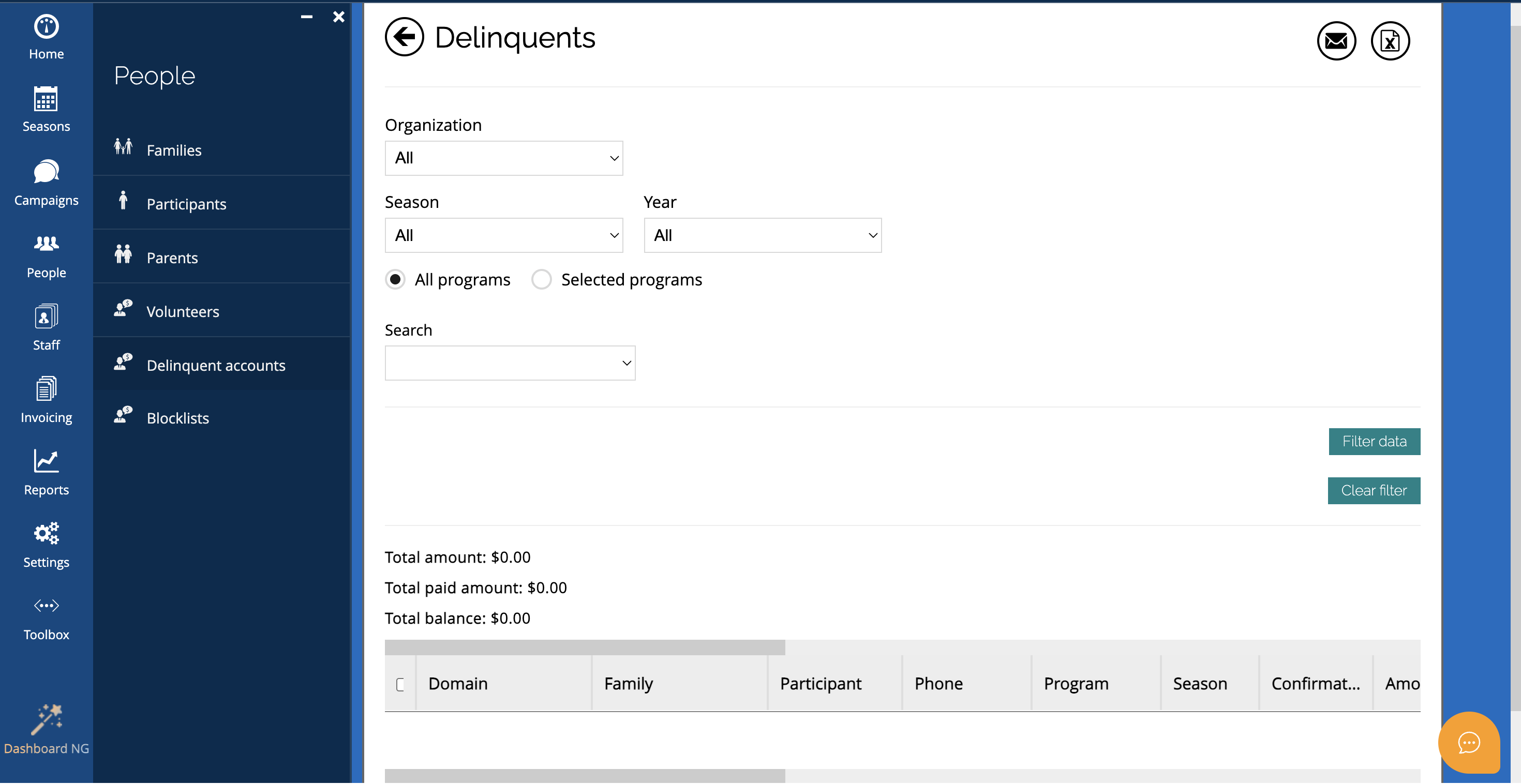 If you use payment plans or automatic billing, the Delinquent tab is a vital feature. The system automatically tags accounts as Delinquent if a payment is past due under your policies. Use this view to identify outstanding debts and quickly follow up with families.