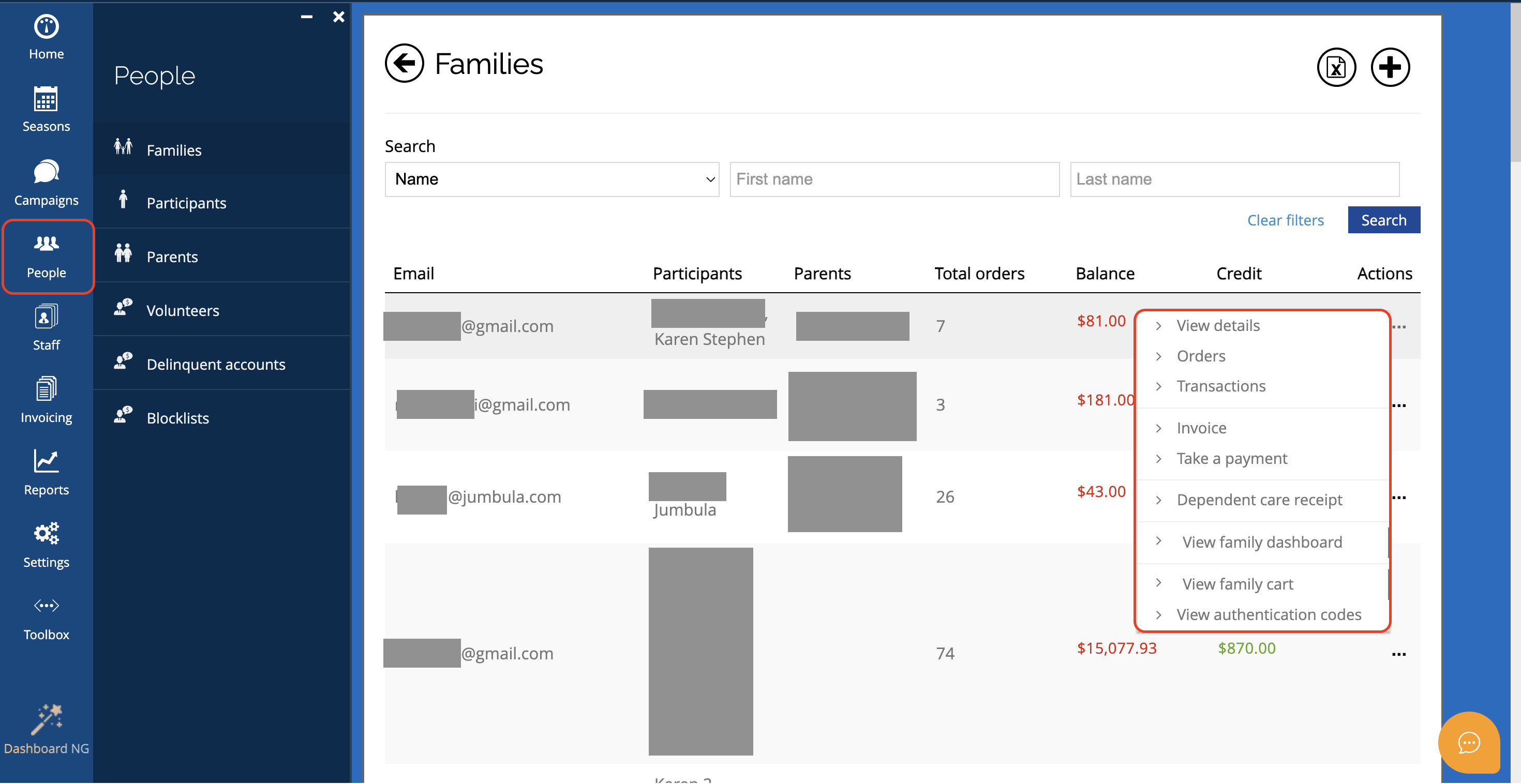 The People tab is the central repository for all individuals connected to your organization. It goes beyond a simple contact list, providing a comprehensive 360-degree view of families, participants, and staff. From this tab, you can manage financial balances, generate specialized documents (like invoices), handle check-in security codes, and track individual student schedules.