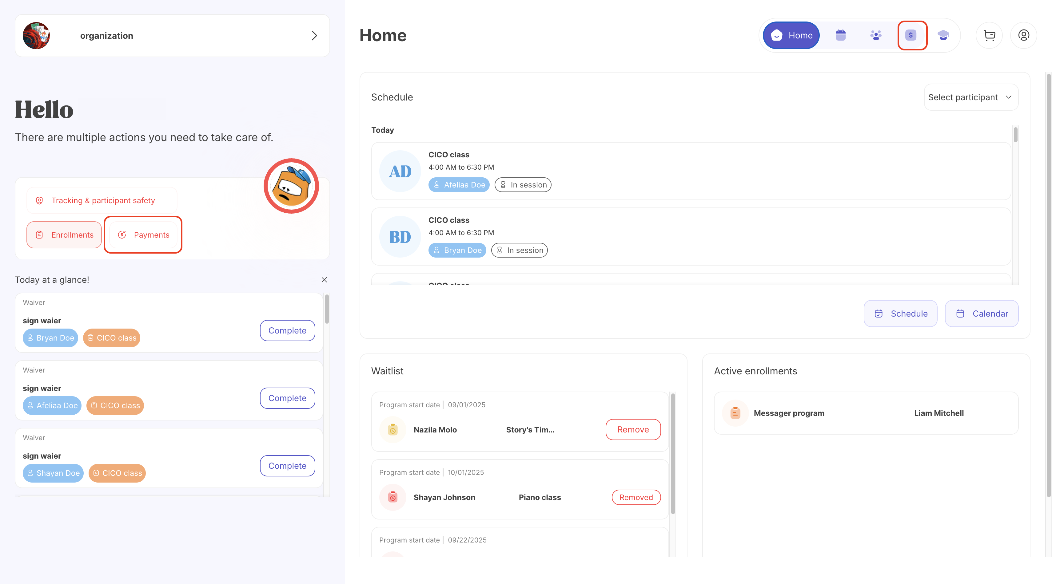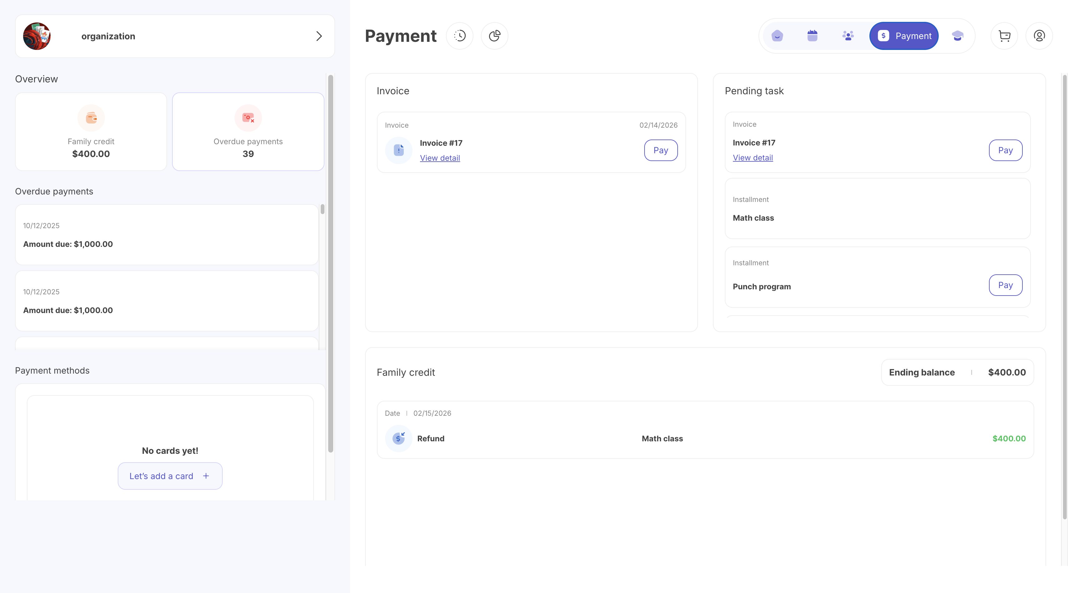 Here you can view your pending payments, family credit, and invoices. You can also manage your payment methods on this page.