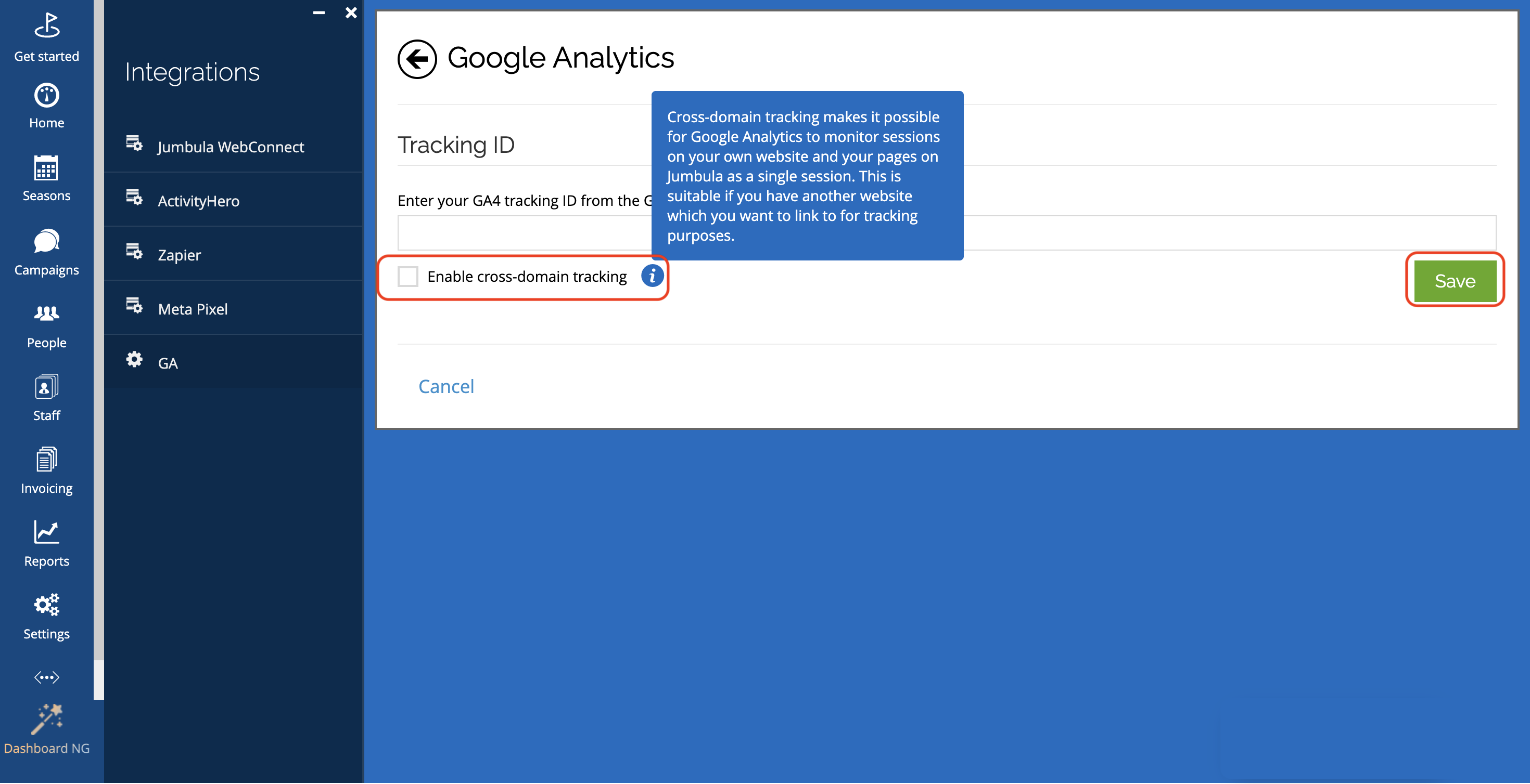 Note: Cross-domain tracking is beneficial if you want to track a visitor who navigates from your website to your Jumbula registration pages. GA will treat it as the same user in reports.