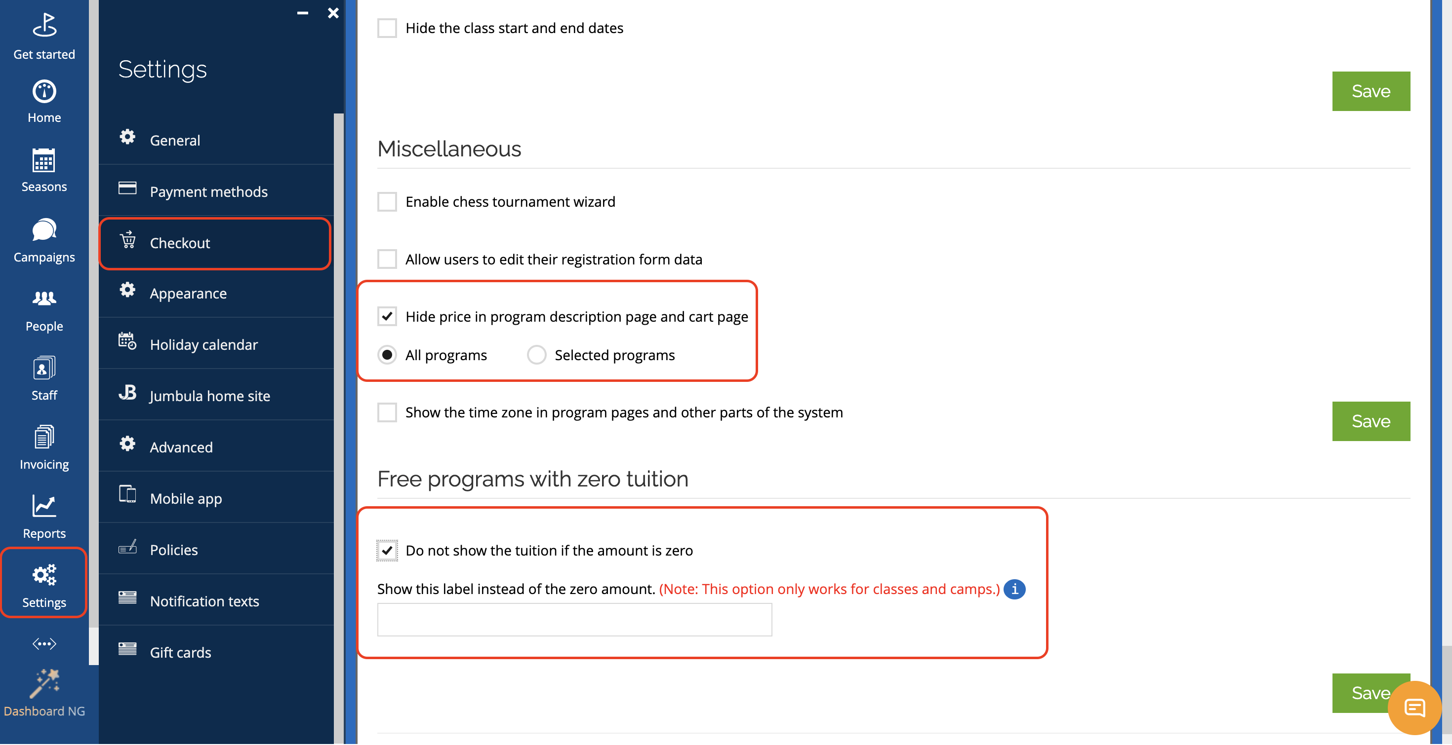 Note: You will be able to set this for all programs or Selected programs.Then, scroll further down to the "Free Programs with Zero Tuition" section. Check the Do not show the tuition if the amount is zero" box, and enter your desired text (e.g., "Free" or "Free program") in the provided field. Click Save.