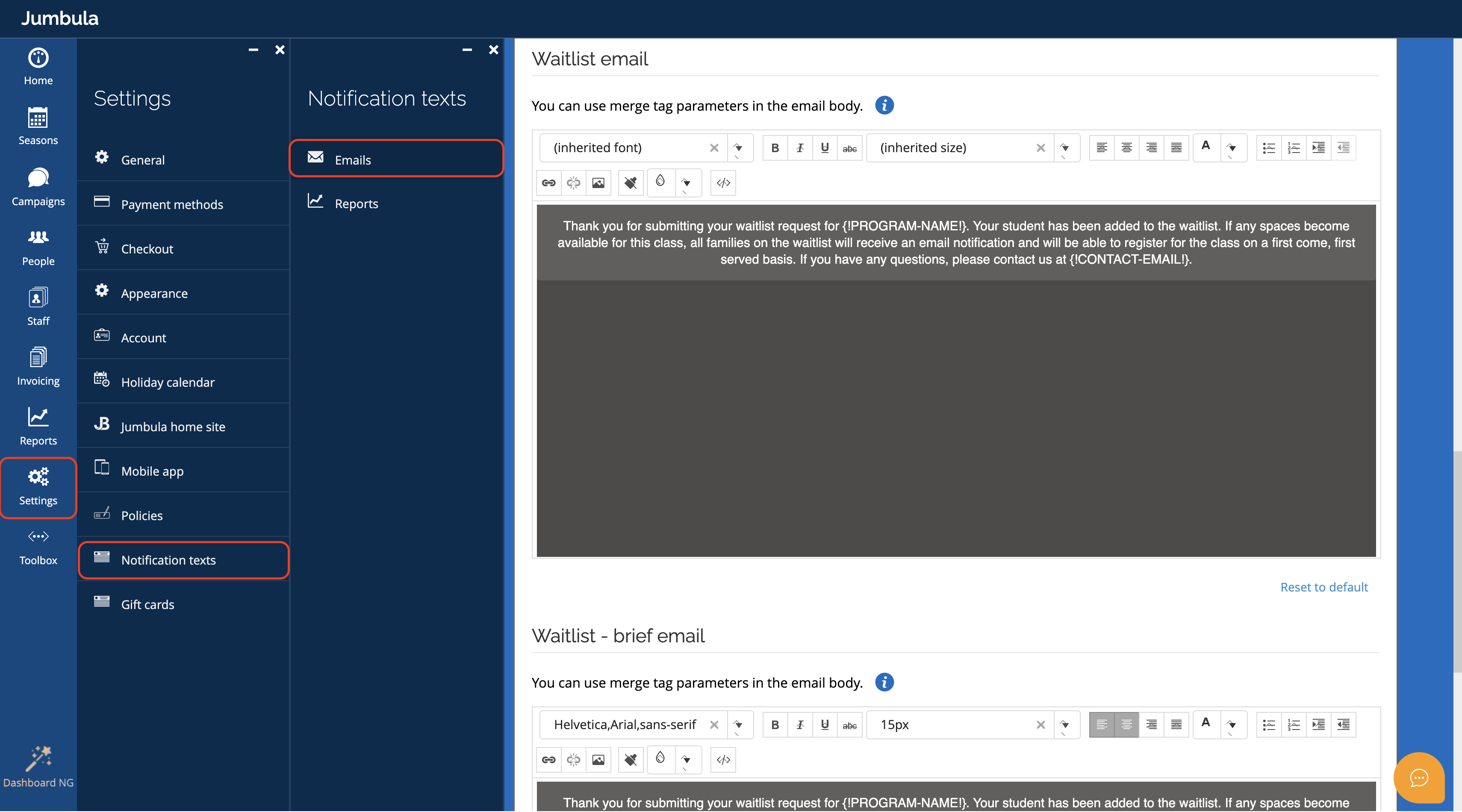 Edit the waitlist email notification text in two sections. After typing your desired email body, click Save.