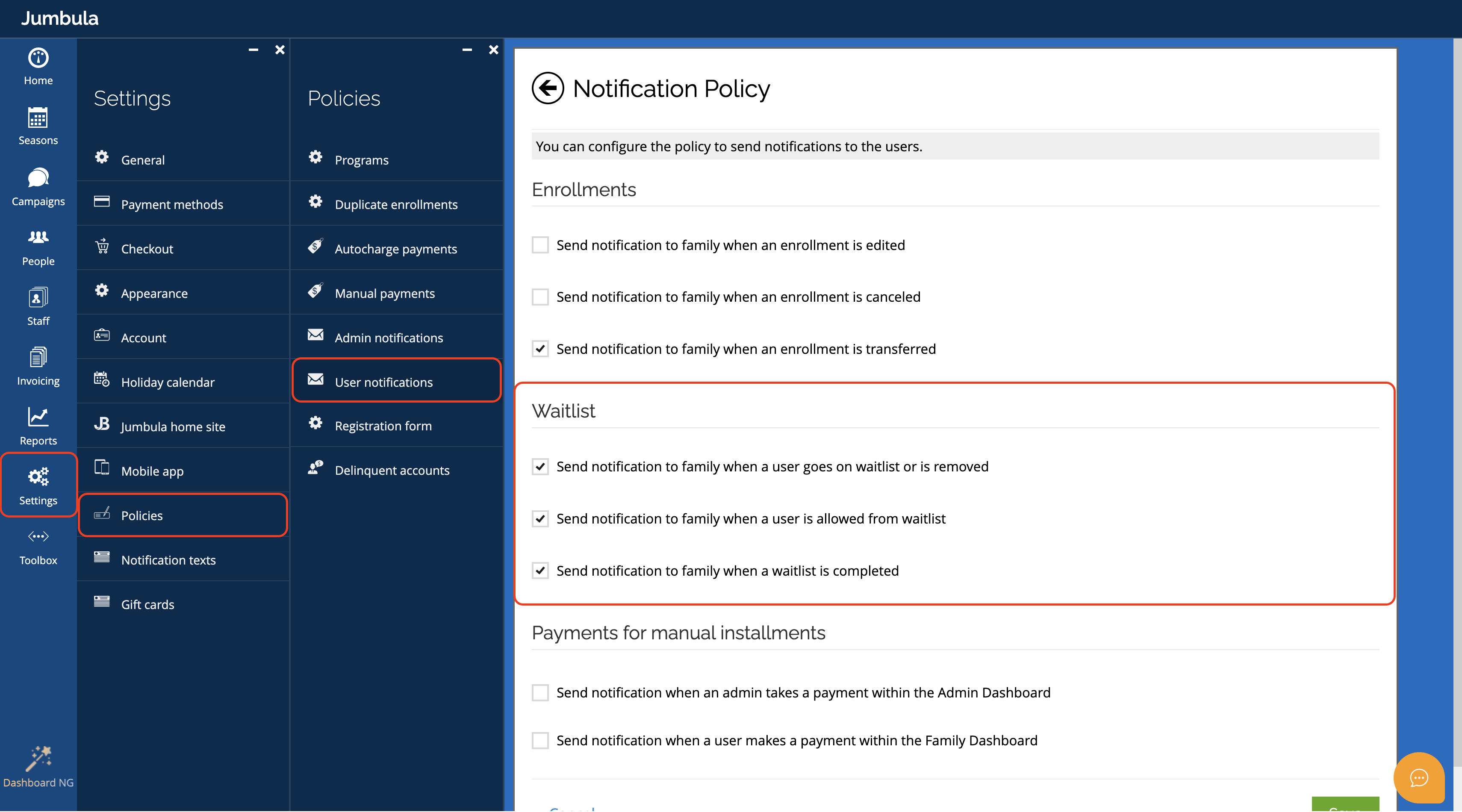 Go to Admin Dashboard > Settings > Policies > User notifications. In the Waitlist email section, select the applicable options, then click Save.