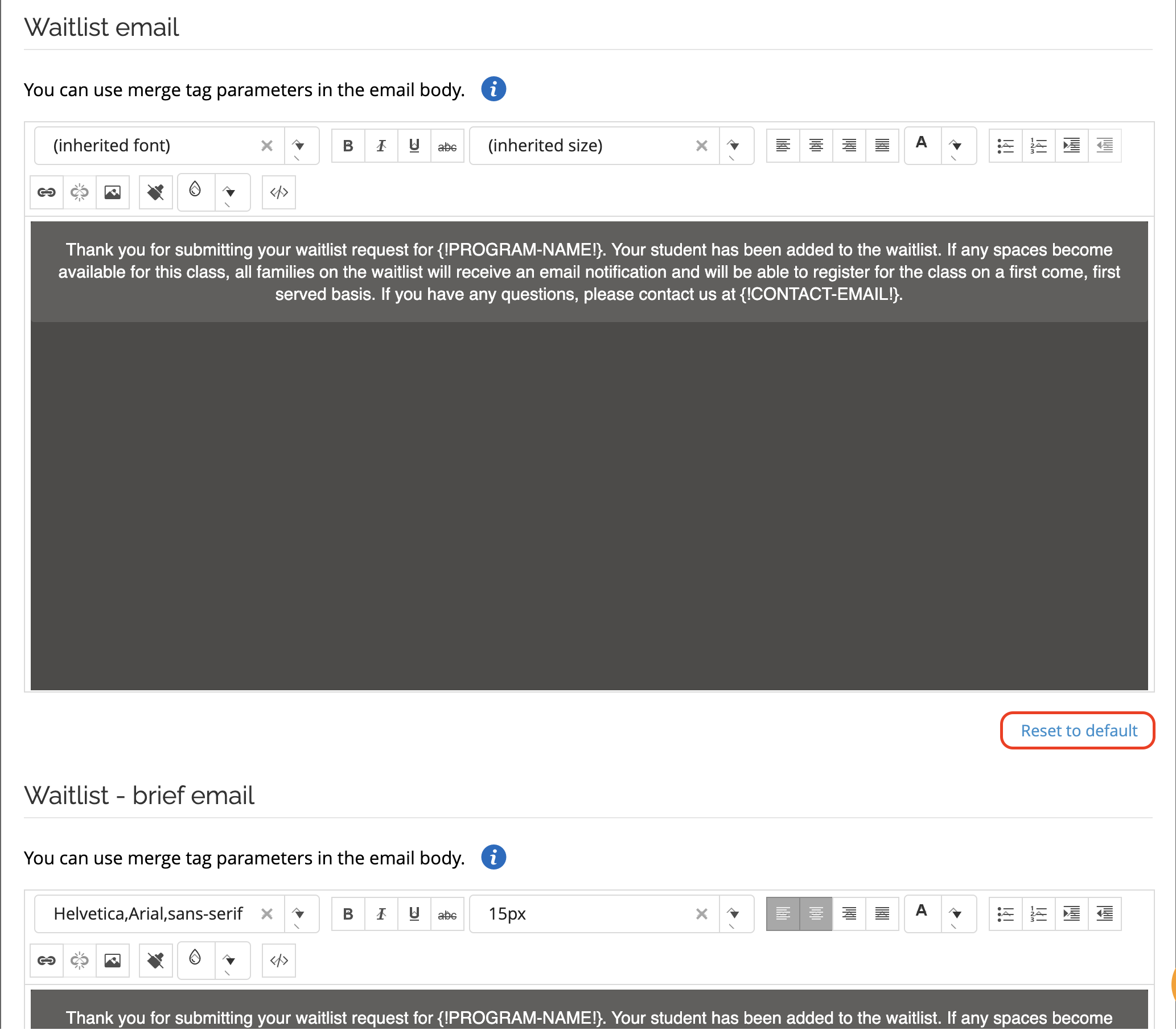 Note: The Reset to default button below the editor allows you to reset the message to its default version at any time.