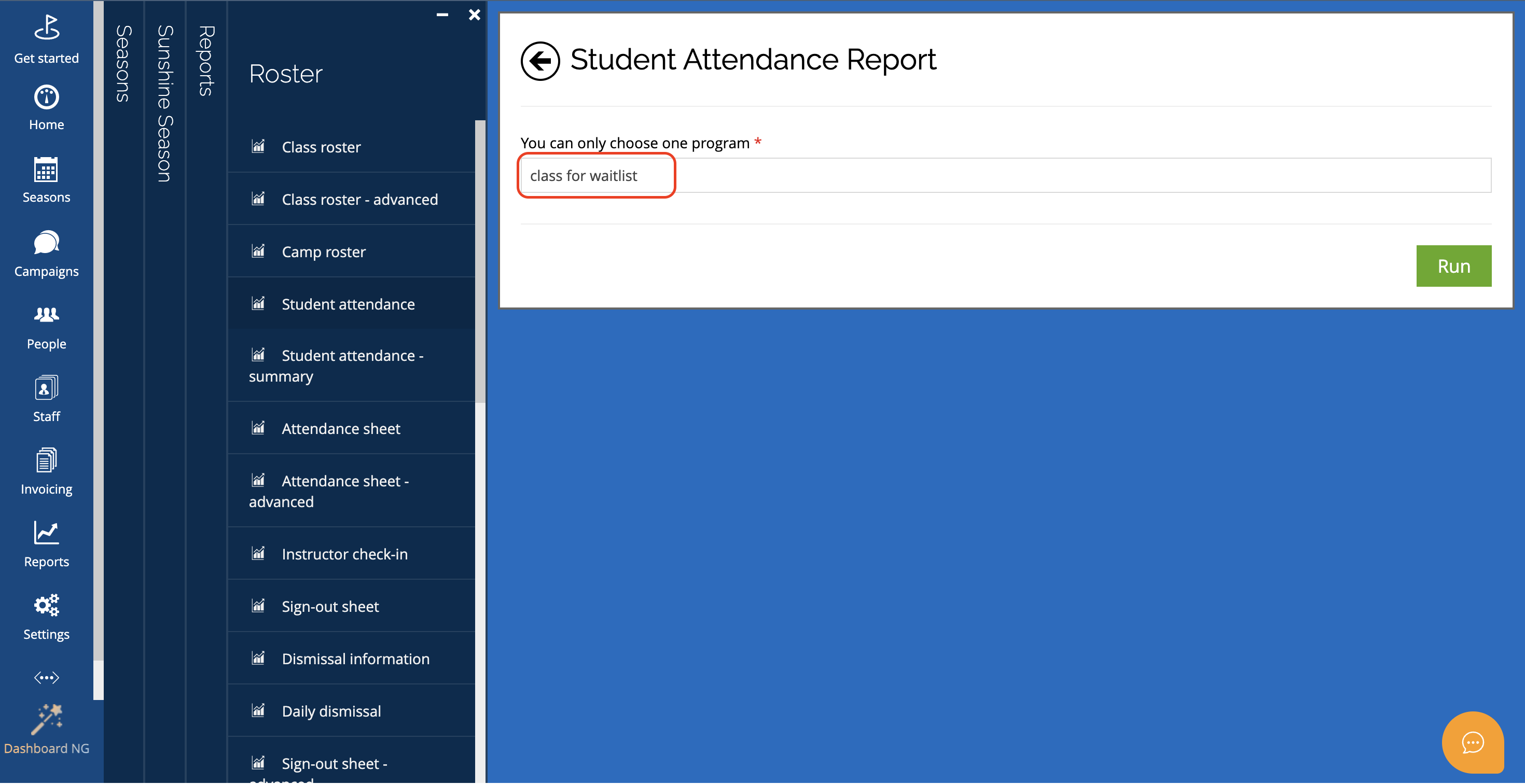Provides a quick way to track attendance trends for a single program over time.How to runGo to: Seasons > Select Season > Reports > Rosters > Student Attendance - Summary ReportWhat this report includes: