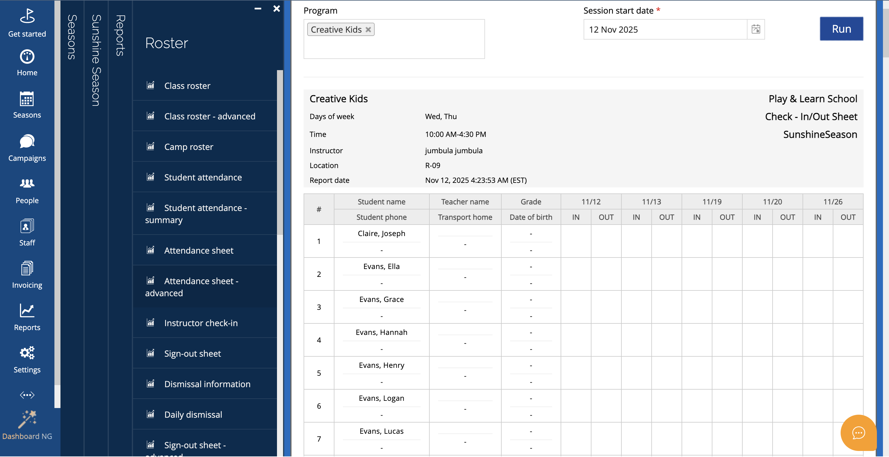 Path: Seasons > (choose Season) > Reports > Roster > Attendance Sheet