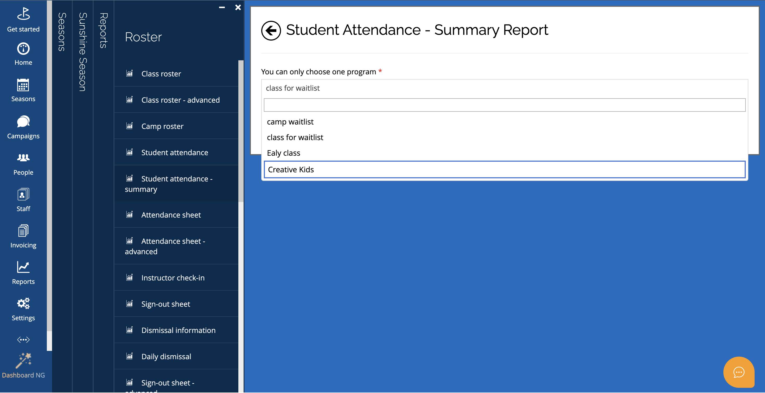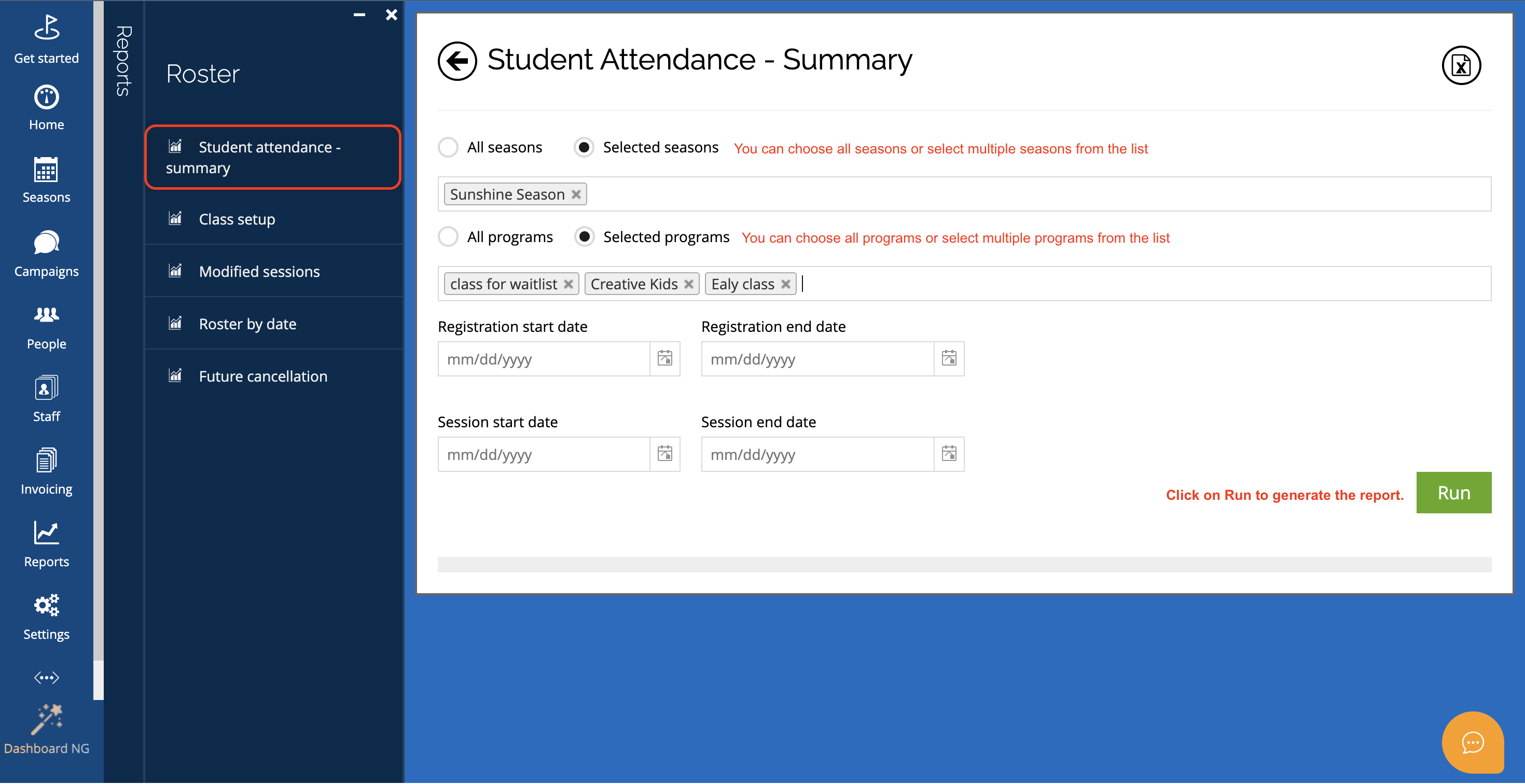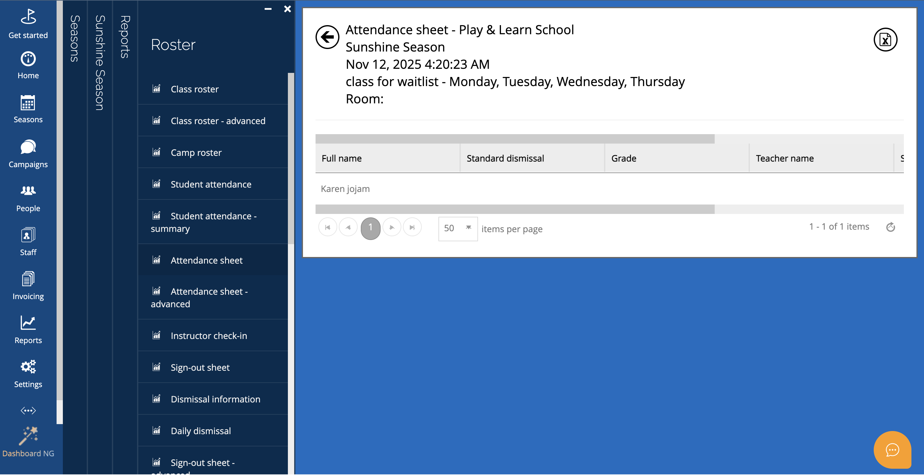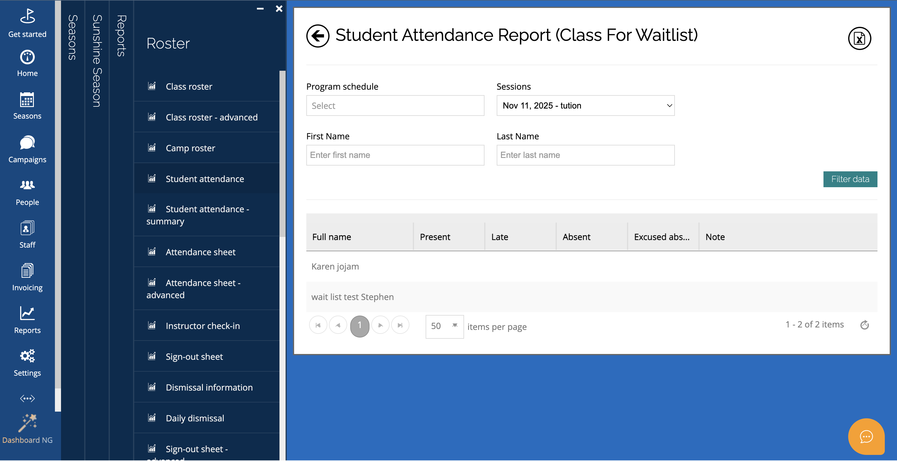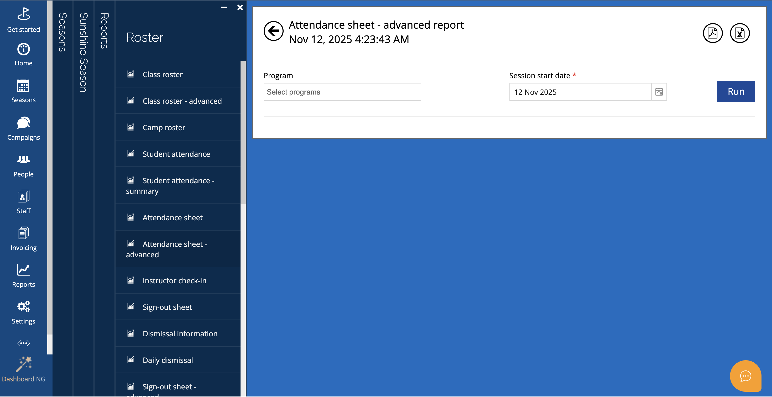 You can export the report using the export icon at the top right of the screen.2. Student attendance – roster by season