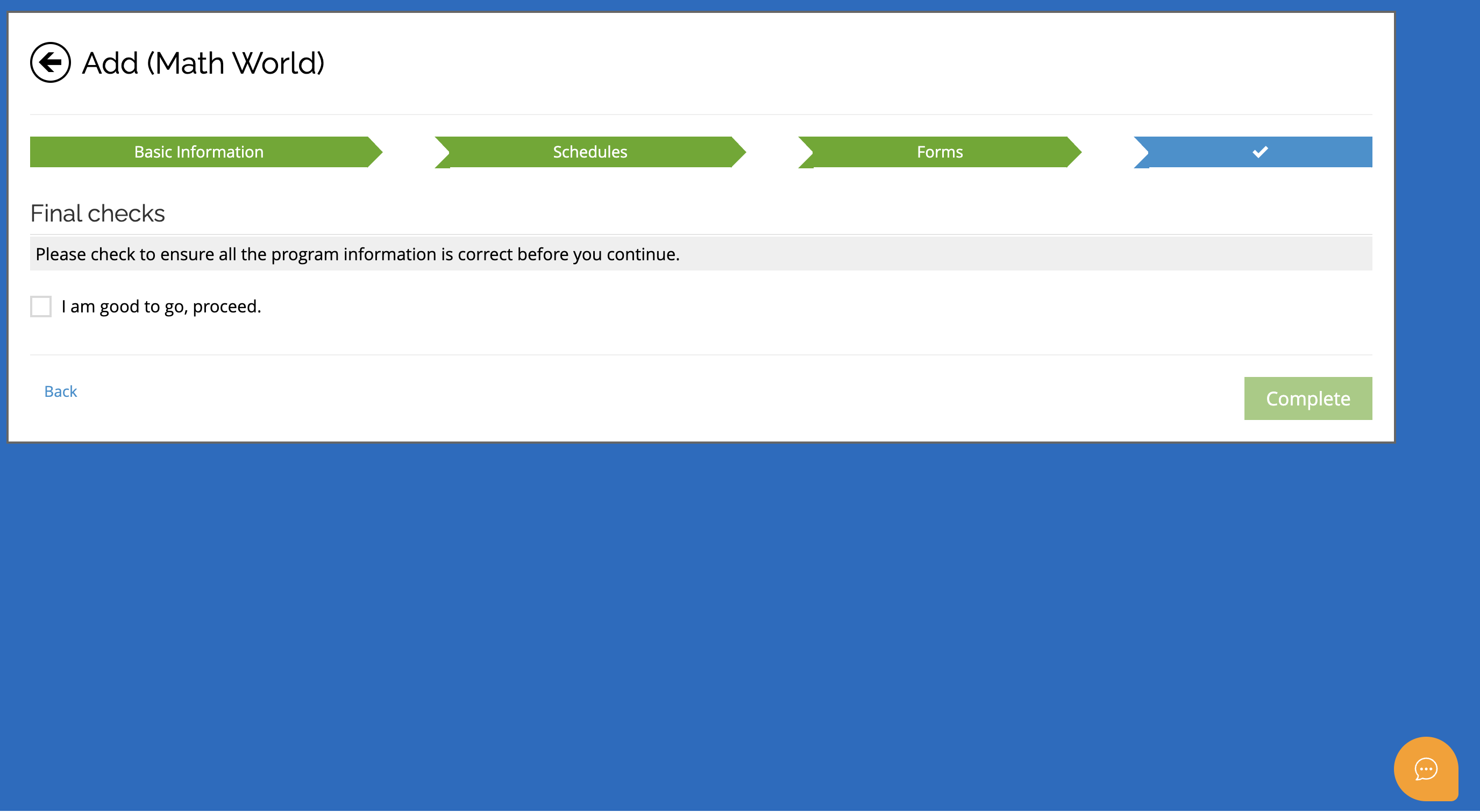 The final step is the confirmation stage. This page serves as a final verification of your intent to publish or save the program.