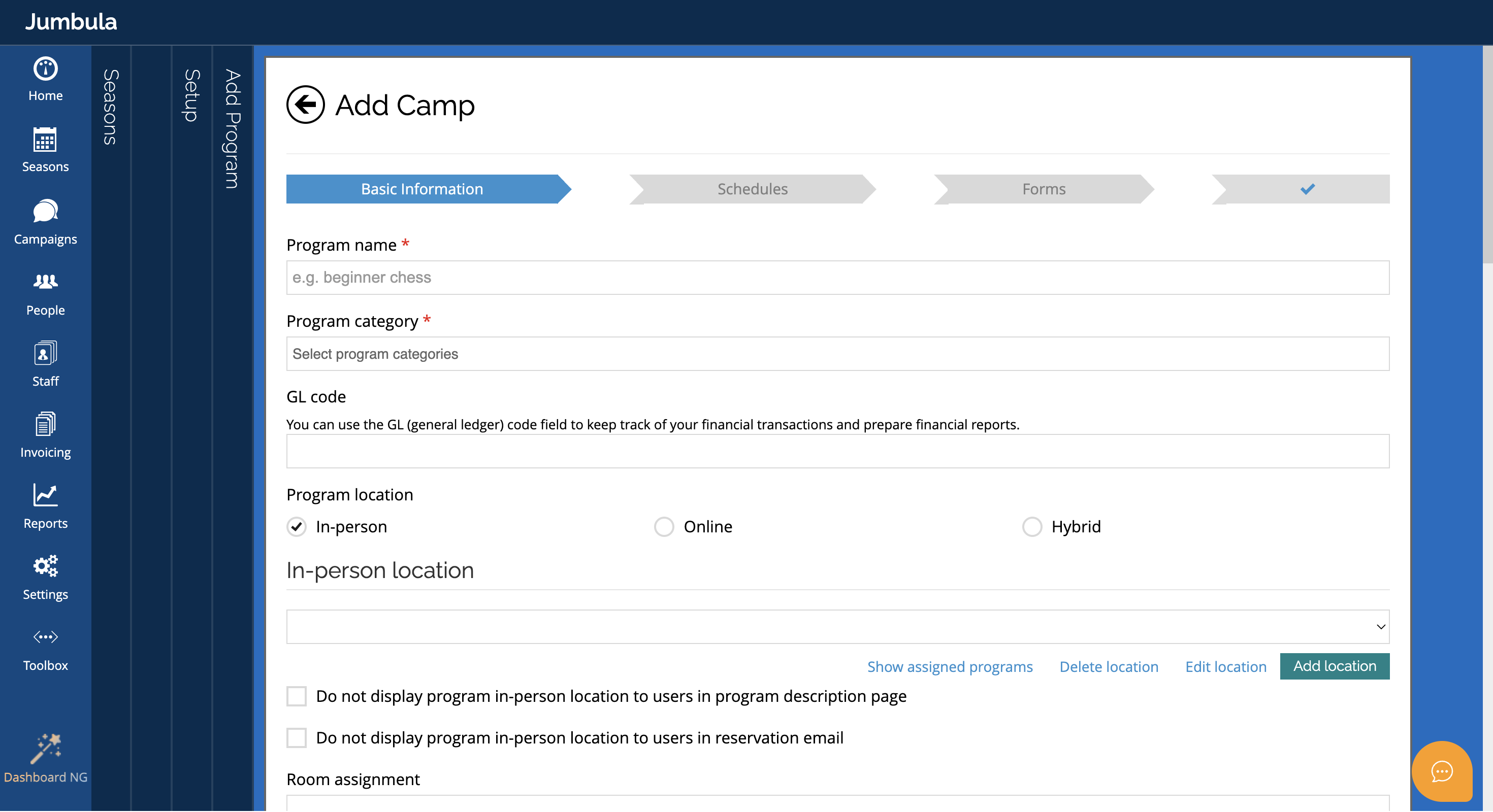 The Camp program type in Jumbula is a specialized tool designed for programs that span multiple days or weeks and require a high level of scheduling flexibility. Whether you are running a traditional summer camp, a sports clinic, or an academic intensive, this setup allows you to group multiple sessions under a single program heading.