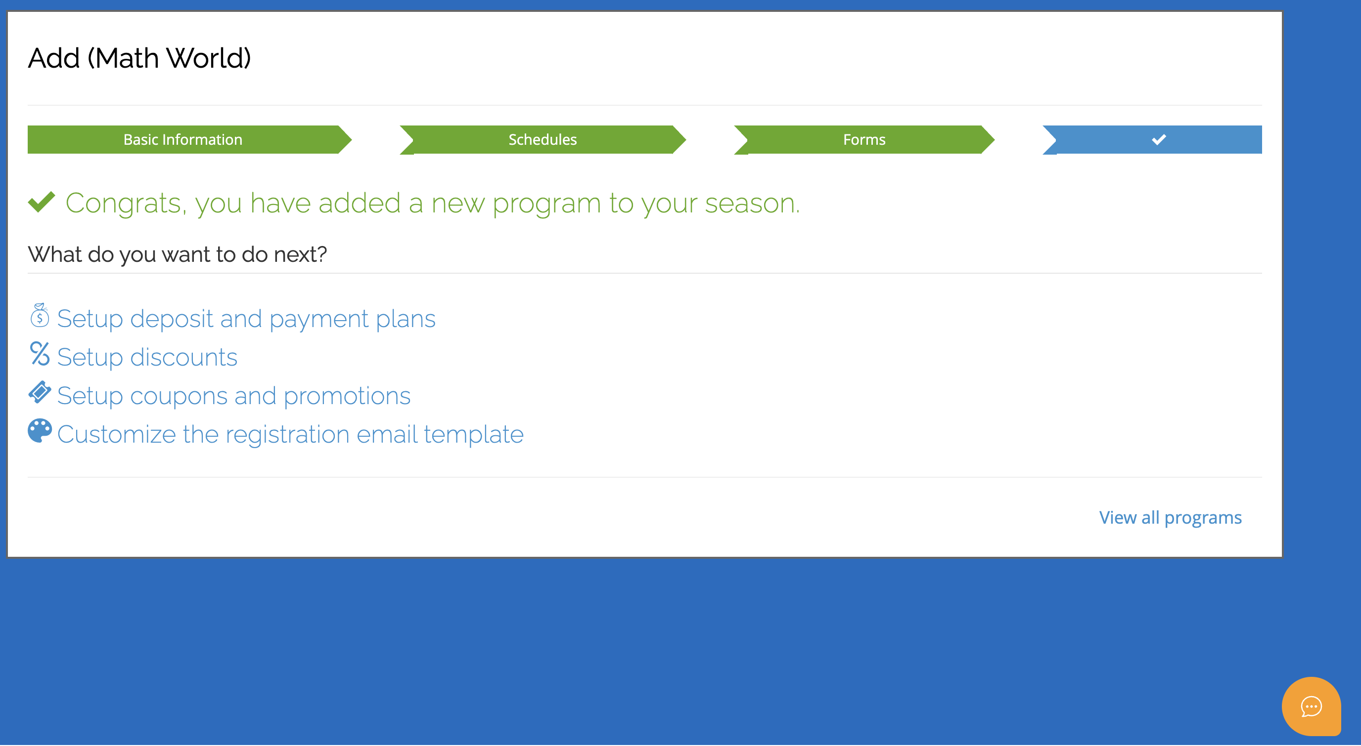 After completing, you will see a confirmation page with options for your next steps, such as customizing the registration email template, setting up discounts and coupons, and more.