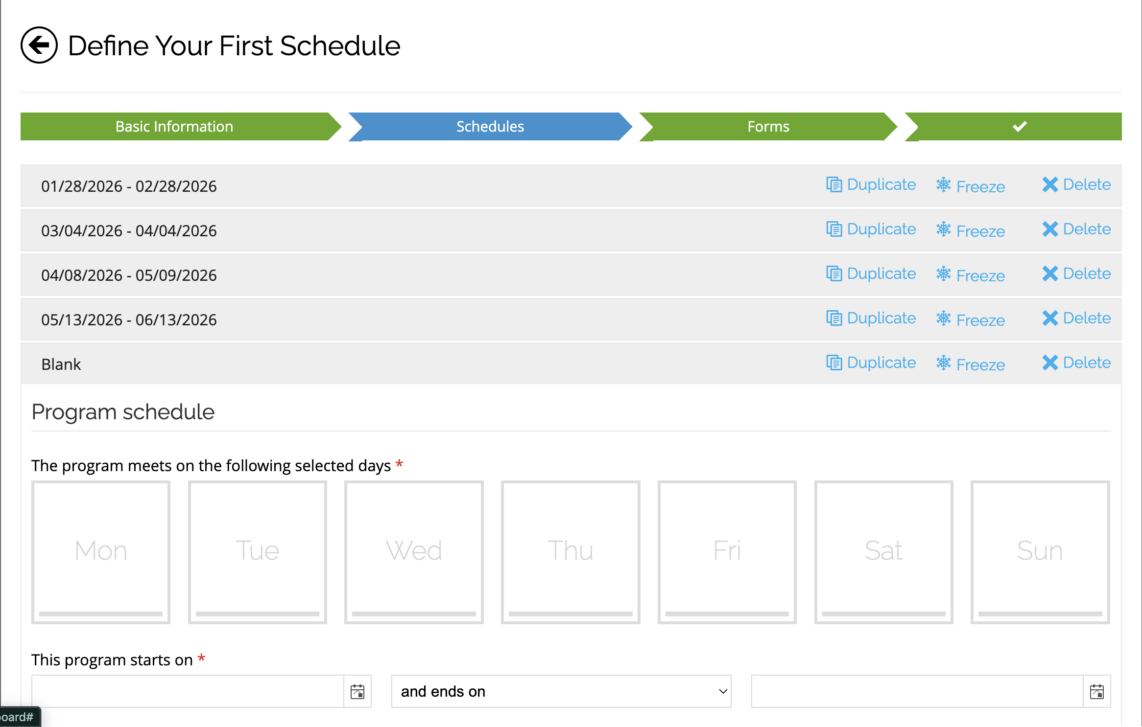Click any schedule to edit its dates and days of the week. To add a new one, click Add a blank schedule, then edit the dates and weekdays.