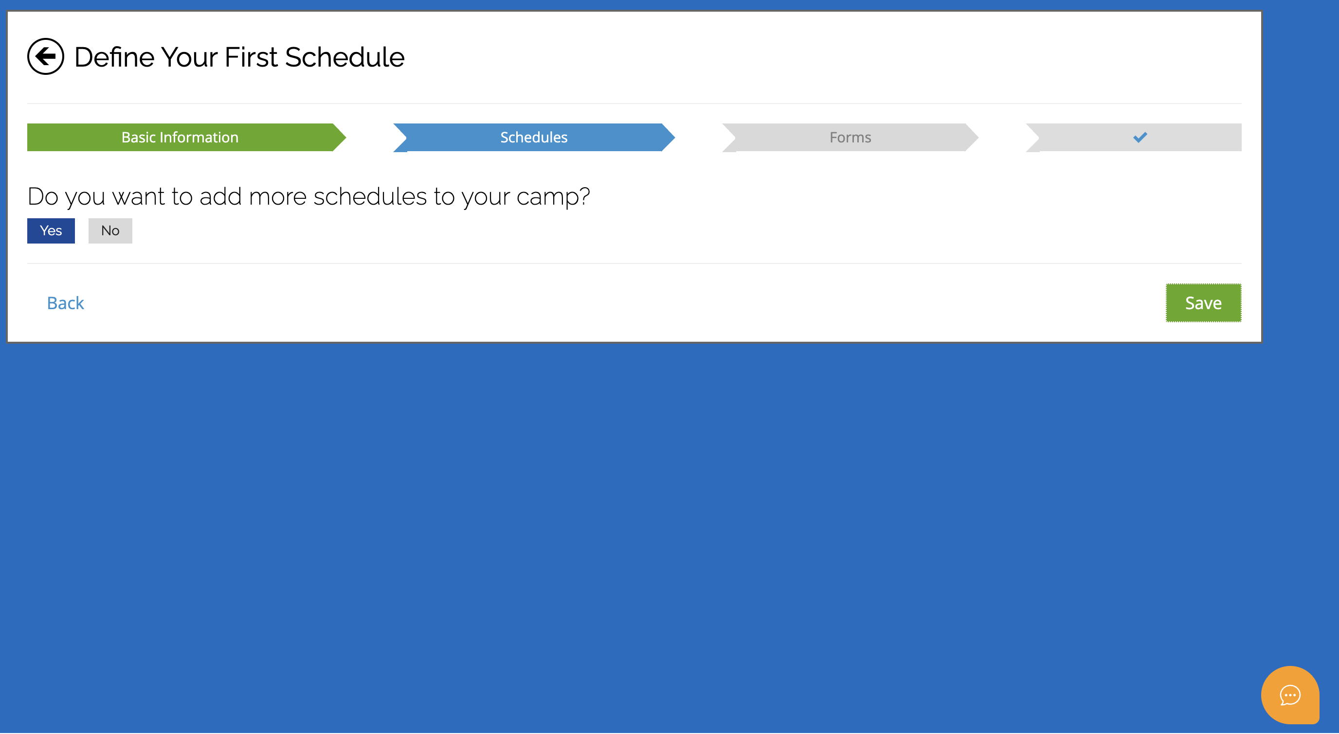 After saving your first schedule, the system will prompt you with a follow-up question: "Do you want to create more schedules?" This is a powerful shortcut for camps that run for multiple weeks.