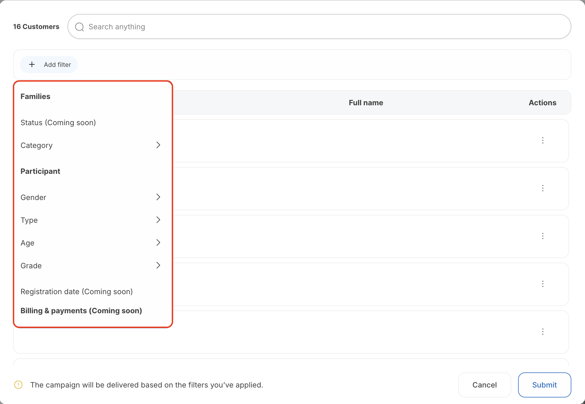 You can also select recipients from your user lists. When you click on Customers, a list of your customers will appear, allowing you to select recipients and apply filters to find your ideal audience, as shown below.