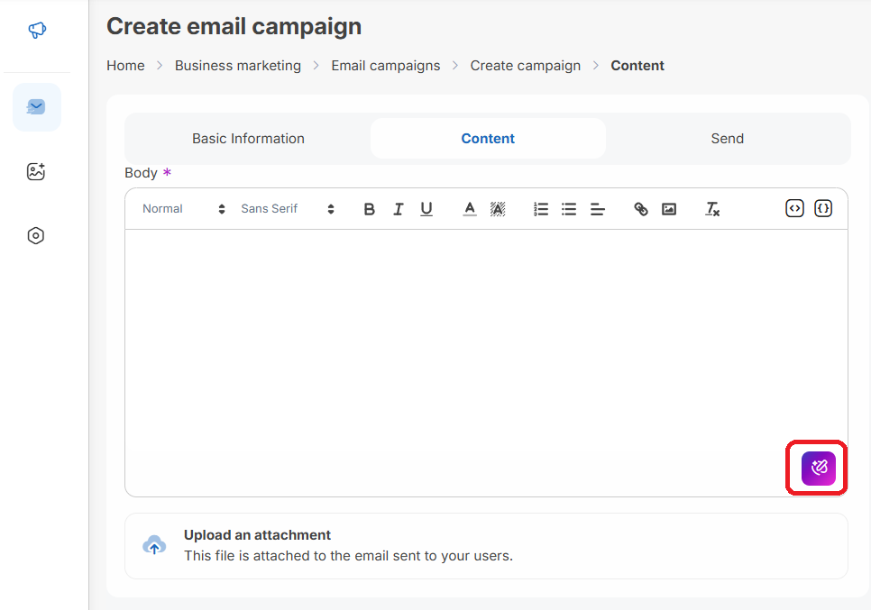 The AI content generator can help you create your message quickly and easily. Enter your prompt in the body and click on the AI icon at the bottom of the text editor. The AI will then create the email content for you. Use Insert to accept the content or Regenerate to try again.