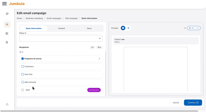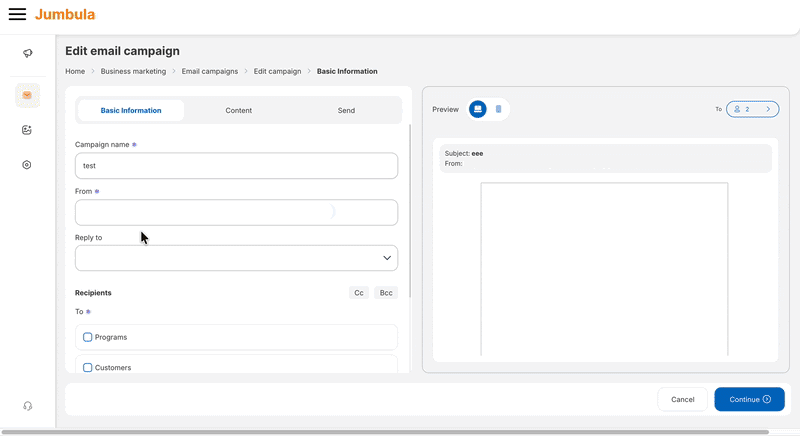 You need to go through three steps — Basic Information, Content, and Send — as seen on the top of the left panel. On the right panel, you can view the campaign email as you build it, including desktop and mobile previews.