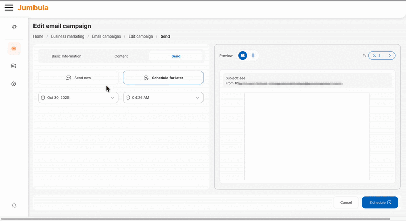 You can choose to send your campaign immediately or schedule it for later. If you select Schedule for later, the date and time fields will appear, allowing you to set your preferred time for the campaign to be sent automatically. The date and time are displayed in your local time zone. If you need to change your time zone, see 'How to Set Your Jumbula Time Zone'.