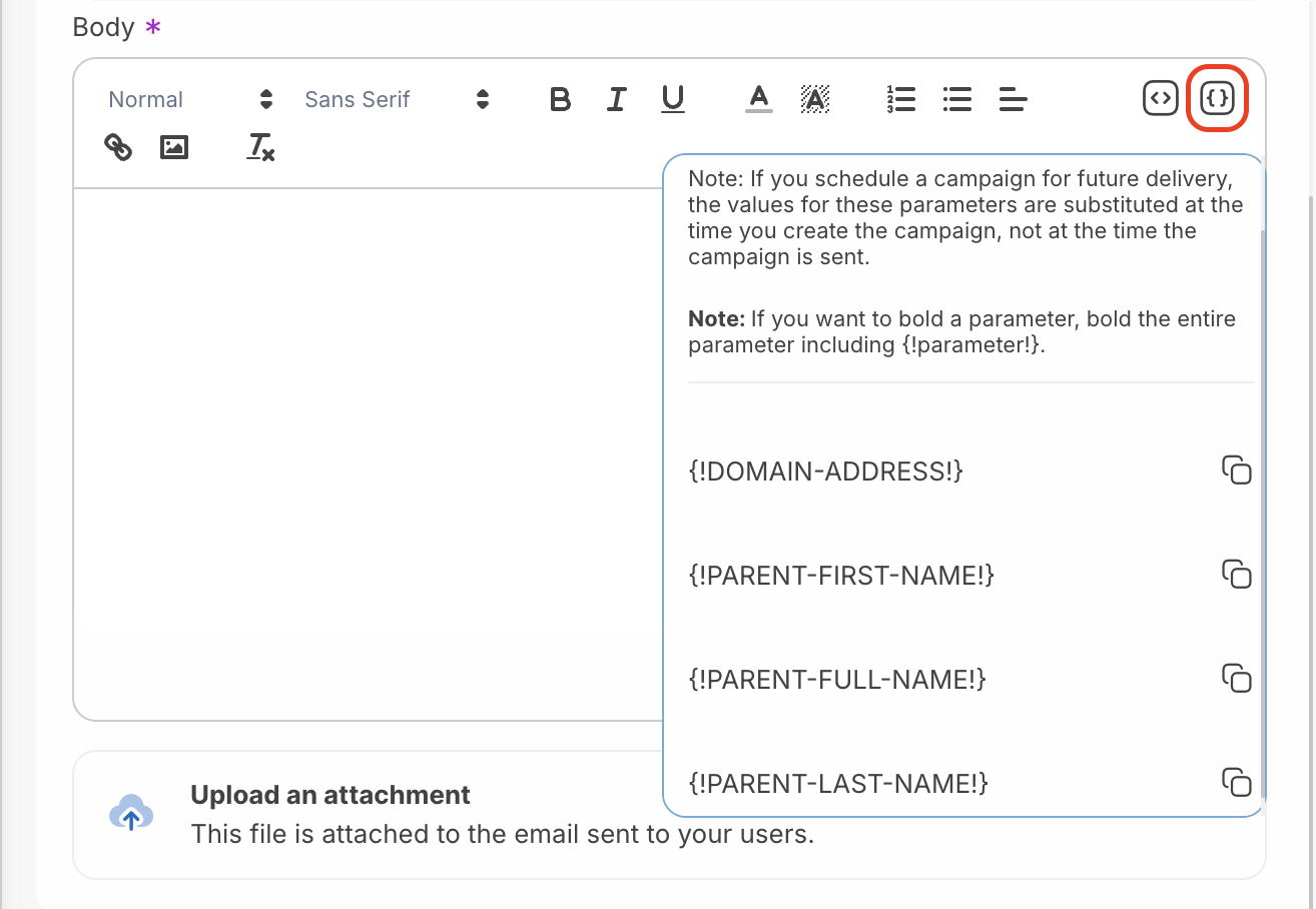 Enter the subject line and use the available system parameters, such as {!DOMAIN-ADDRESS!} or {!PARENT-LAST-NAME!}, to personalize your message. You can view the full list by clicking the button shown in the image below. You can also attach files by clicking Upload an attachment.