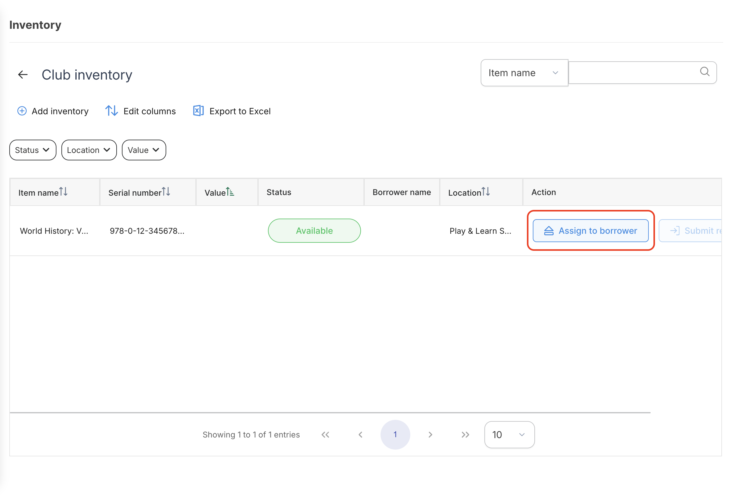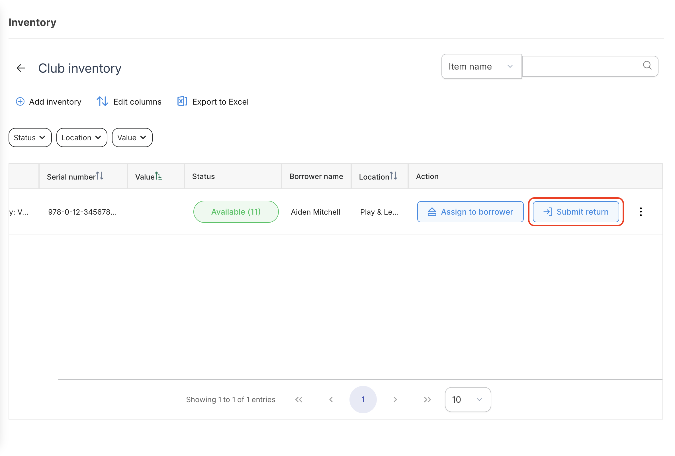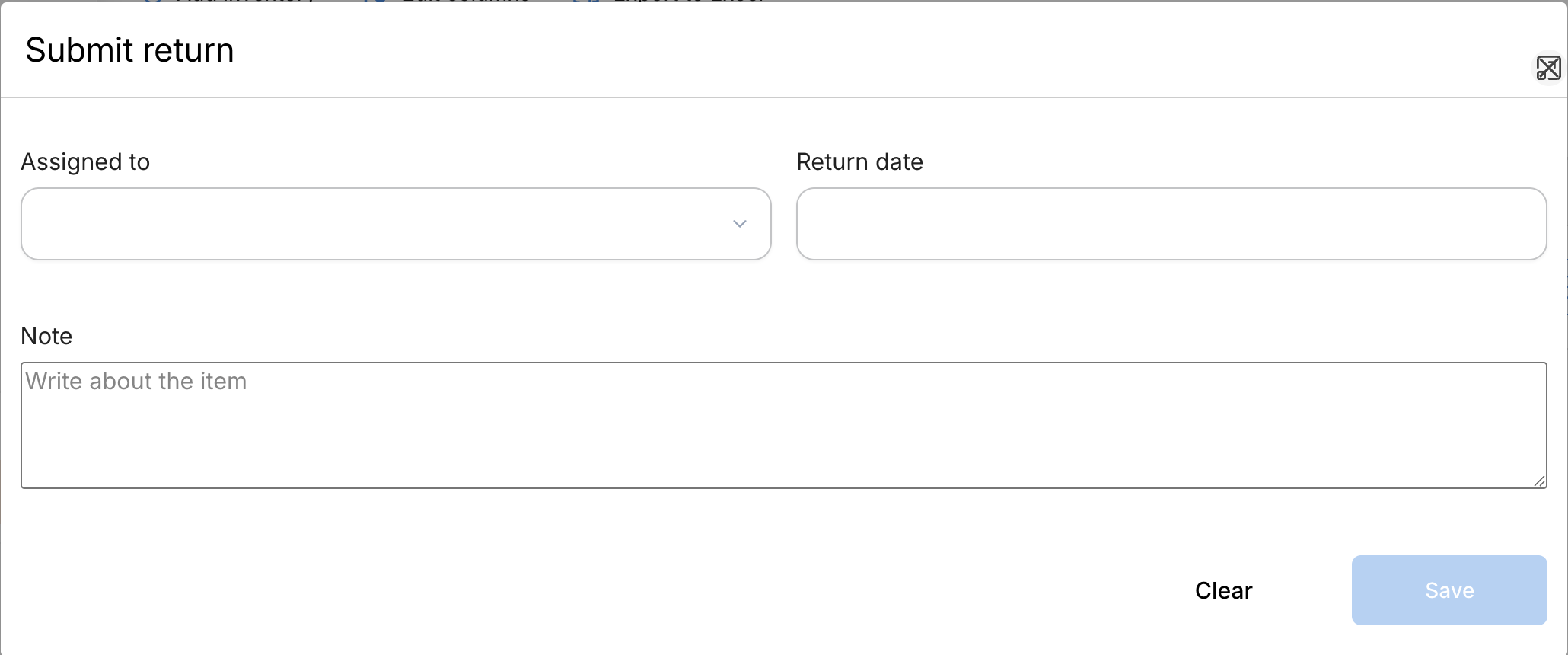 Locate the specific item in your inventory, then select Submit return. In the resulting pop-up window, choose the participant returning the asset, specify the Return date, and include any relevant notes regarding the item's condition before clicking Save.