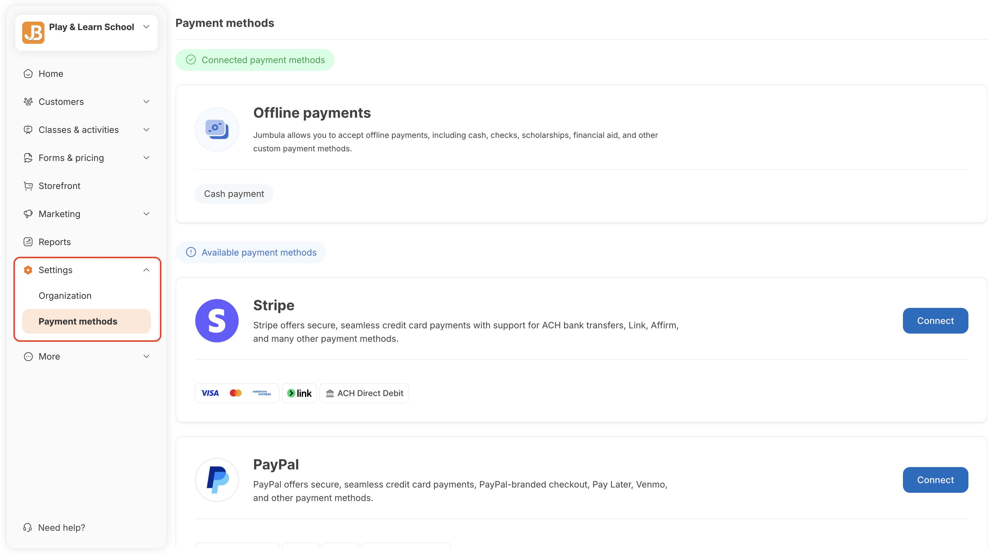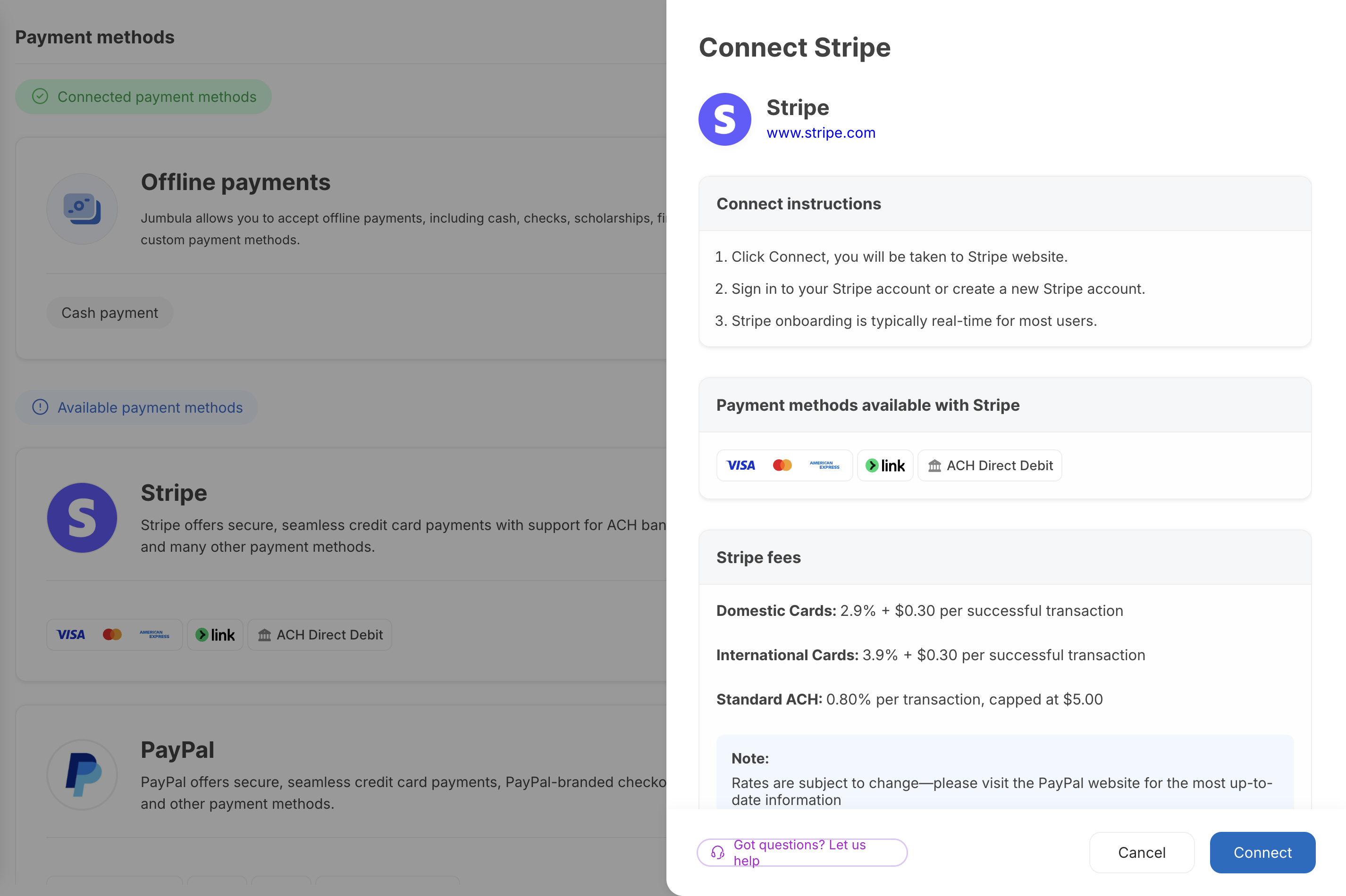 There are currently two online payment methods, plus an option for offline payments. Clicking the Connect button for each method will take you to the service’s website to complete the setup. The screenshot below shows the steps for connecting to Stripe.
