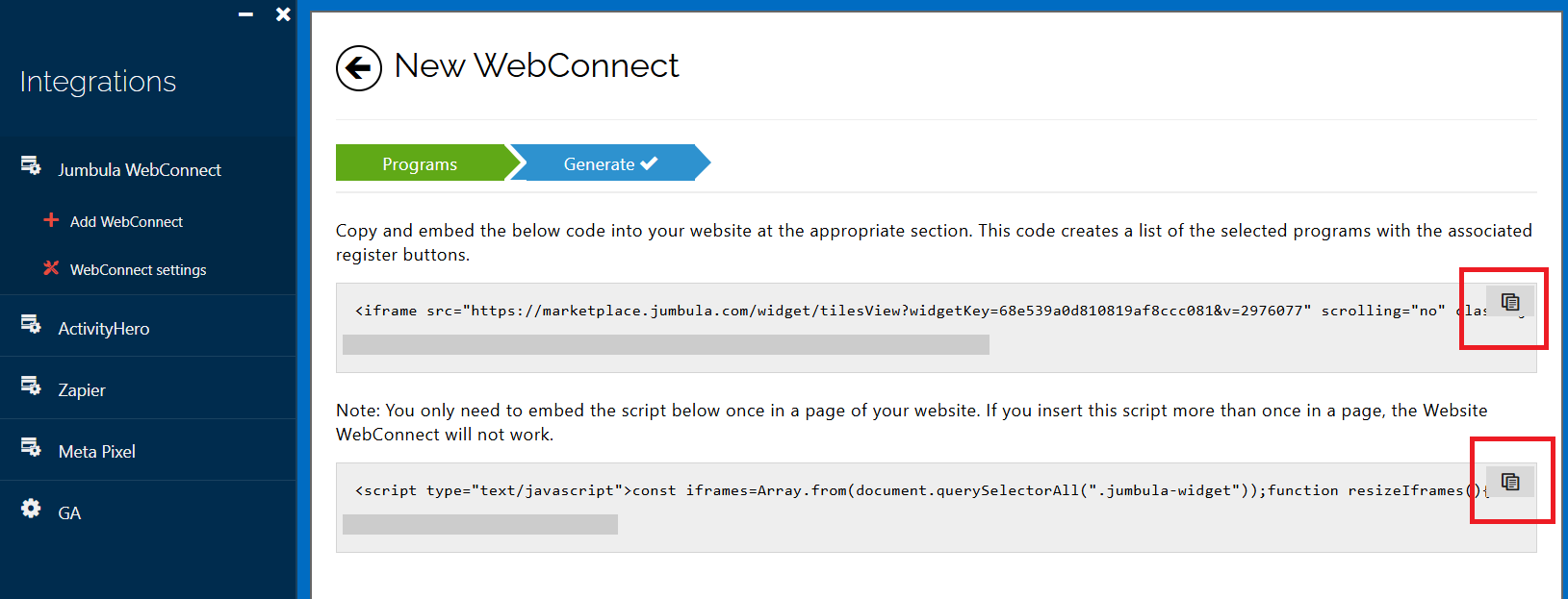 - Go to Classic Admin dashboard -> Toolbox -> Integrations -> Jumbula WebConnect In your Widget list, hover over … (Actions) to see available options.