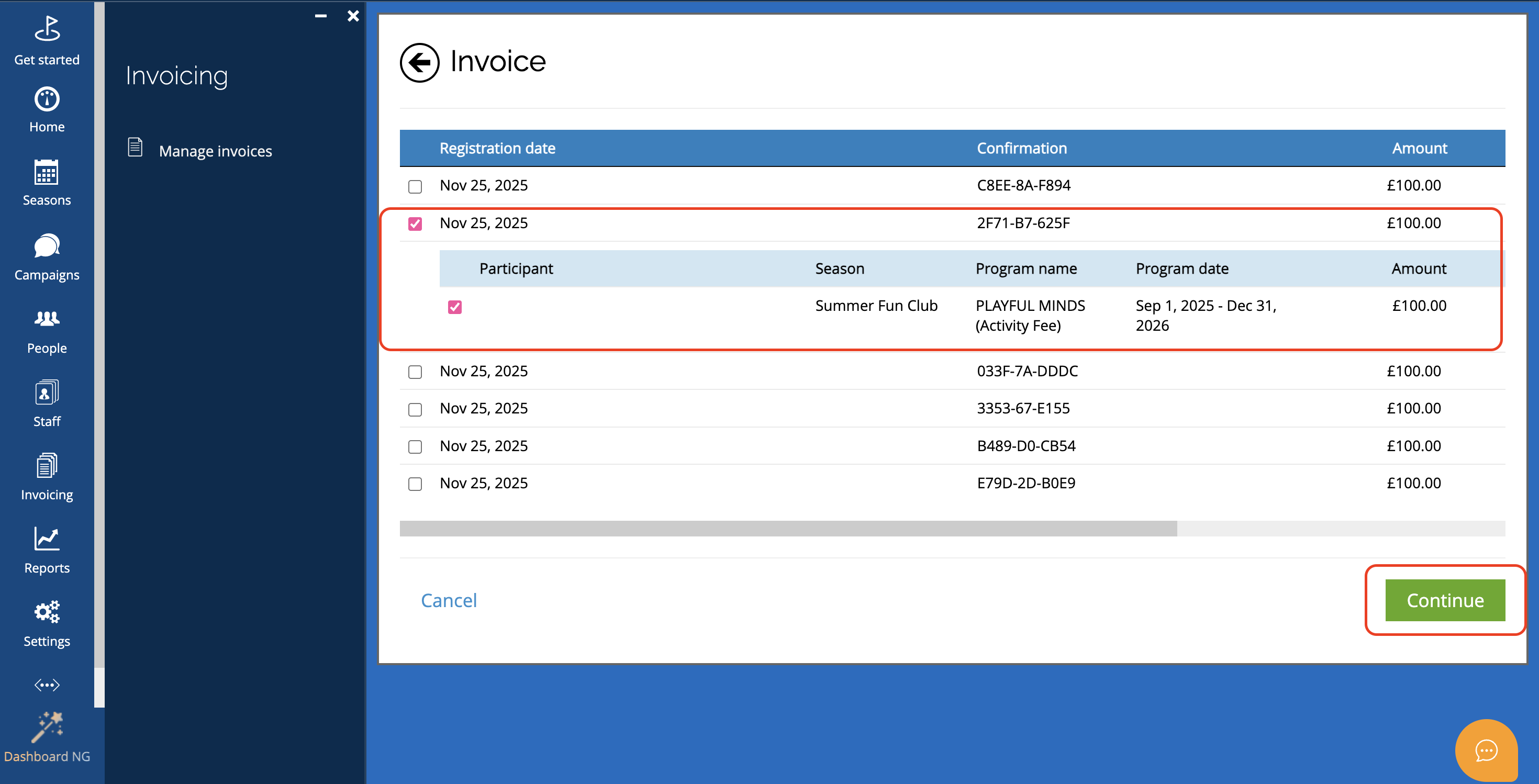 After clicking Invoice, you will see a list of all orders associated with the selected family profile. As shown in the example below, you can click on the checkbox linked to a unique confirmation number. Finally, you can click on the check box for any particular order under that confirmation number, then click Continue.