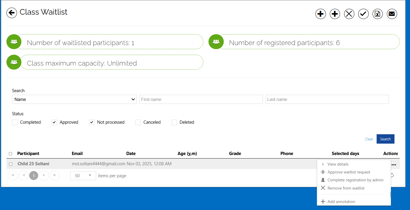 Waitlists work for both single-class registrations and multi-class (season grid) setups.