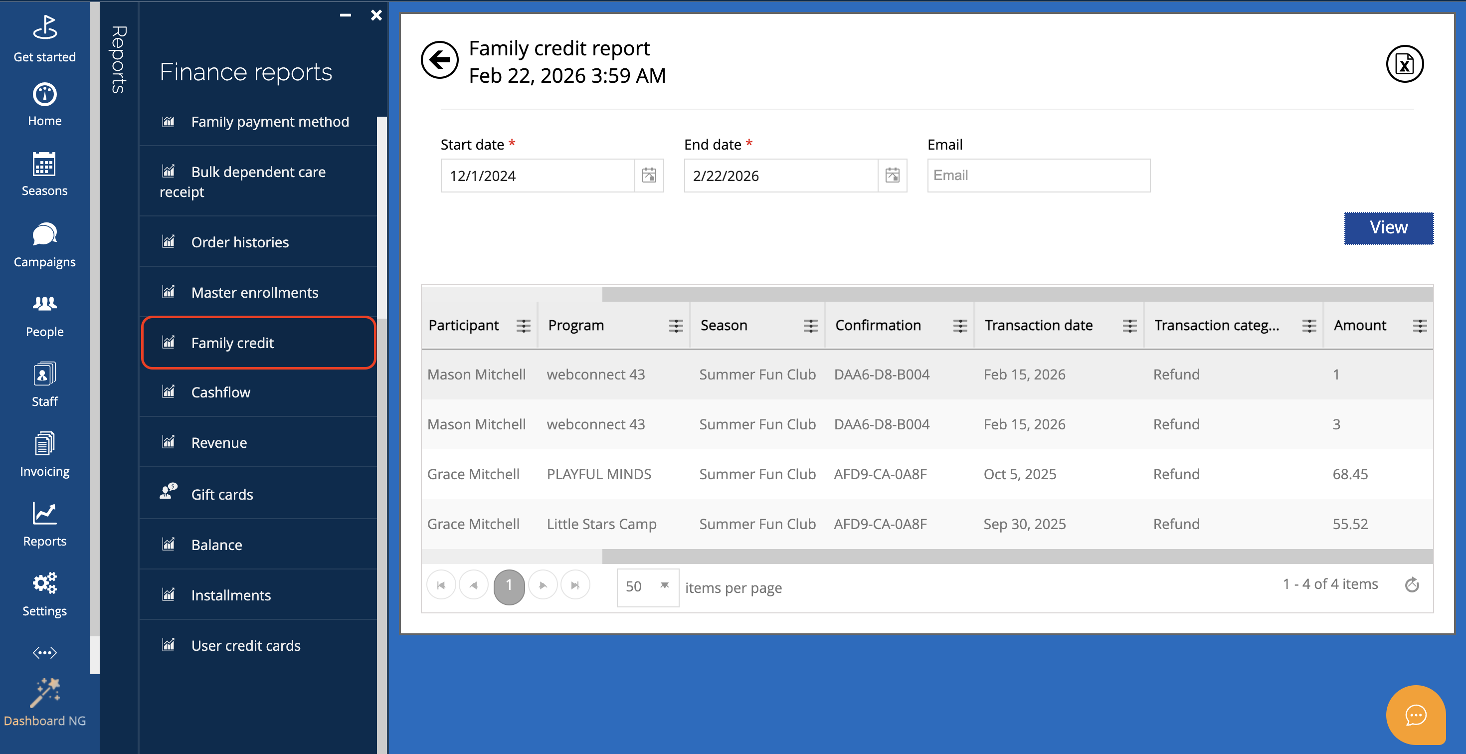 Shows credits issued to families, including remaining balances available for future use. You can generate reports for all email addresses or for a specific one.