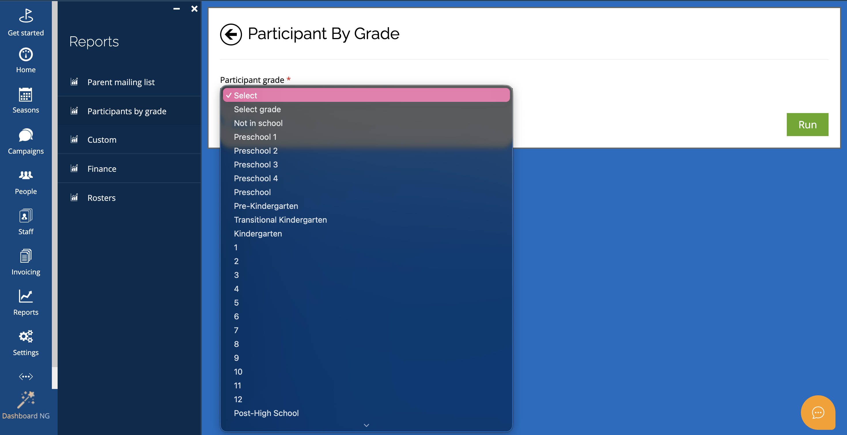 As the name suggests, this section allows you to filter and export participant reports based on grade level.