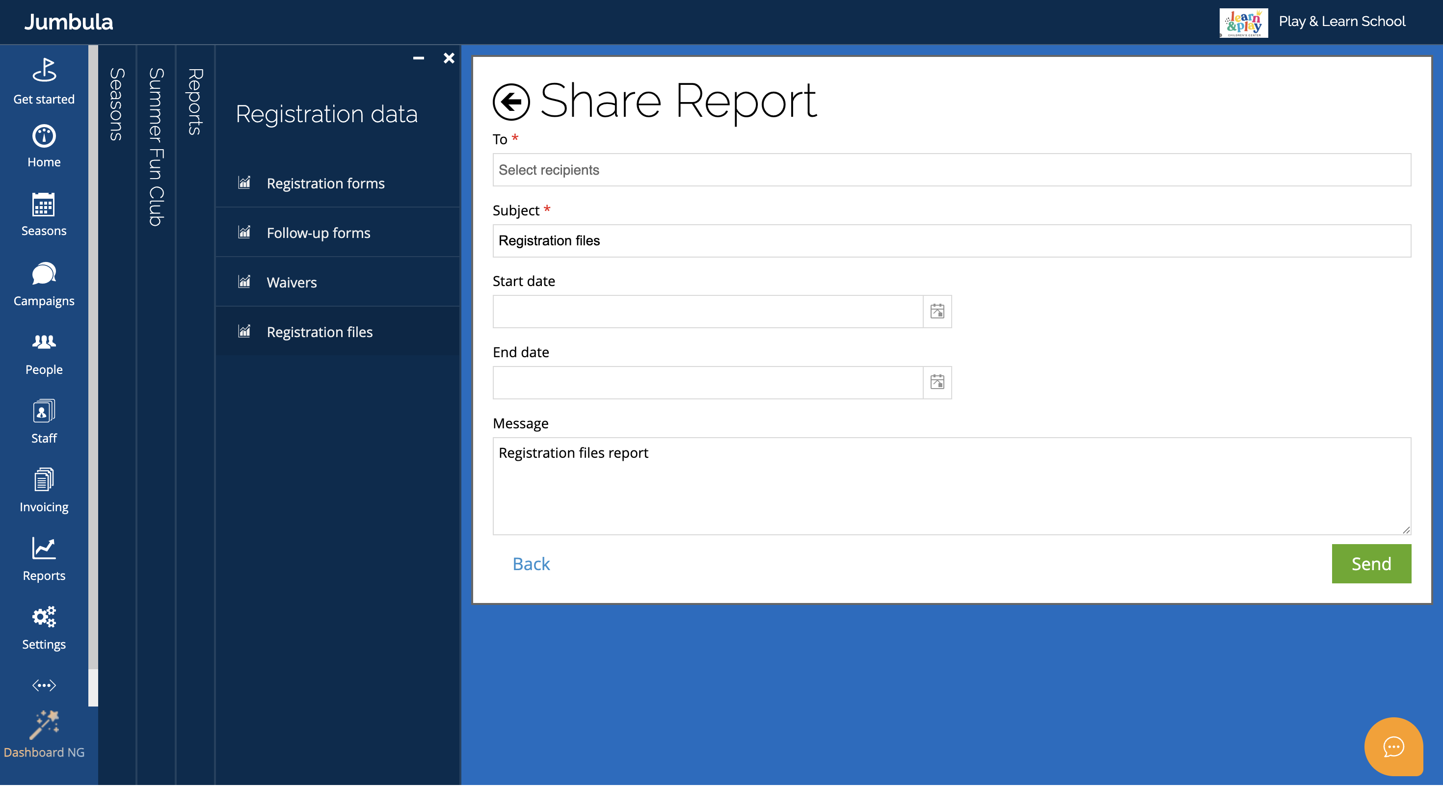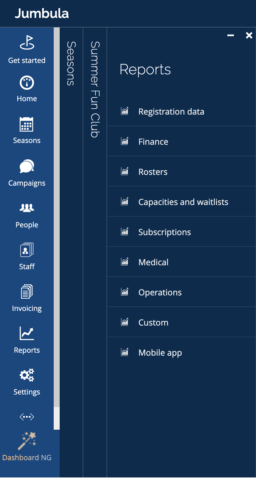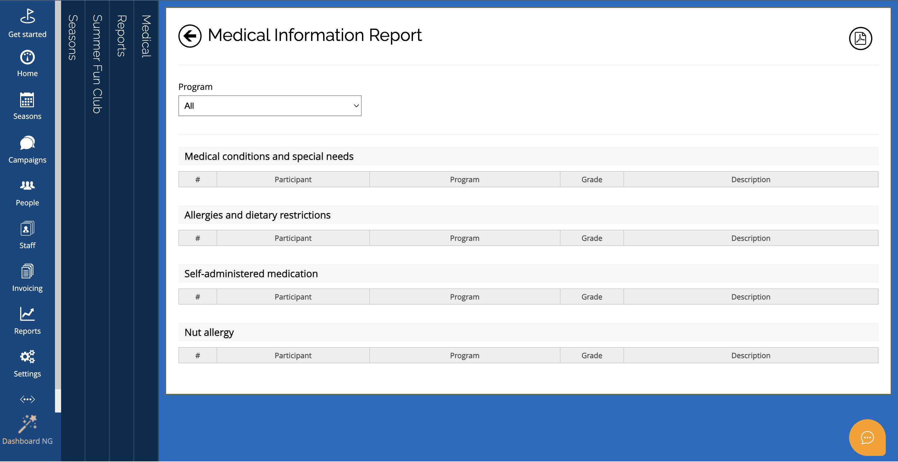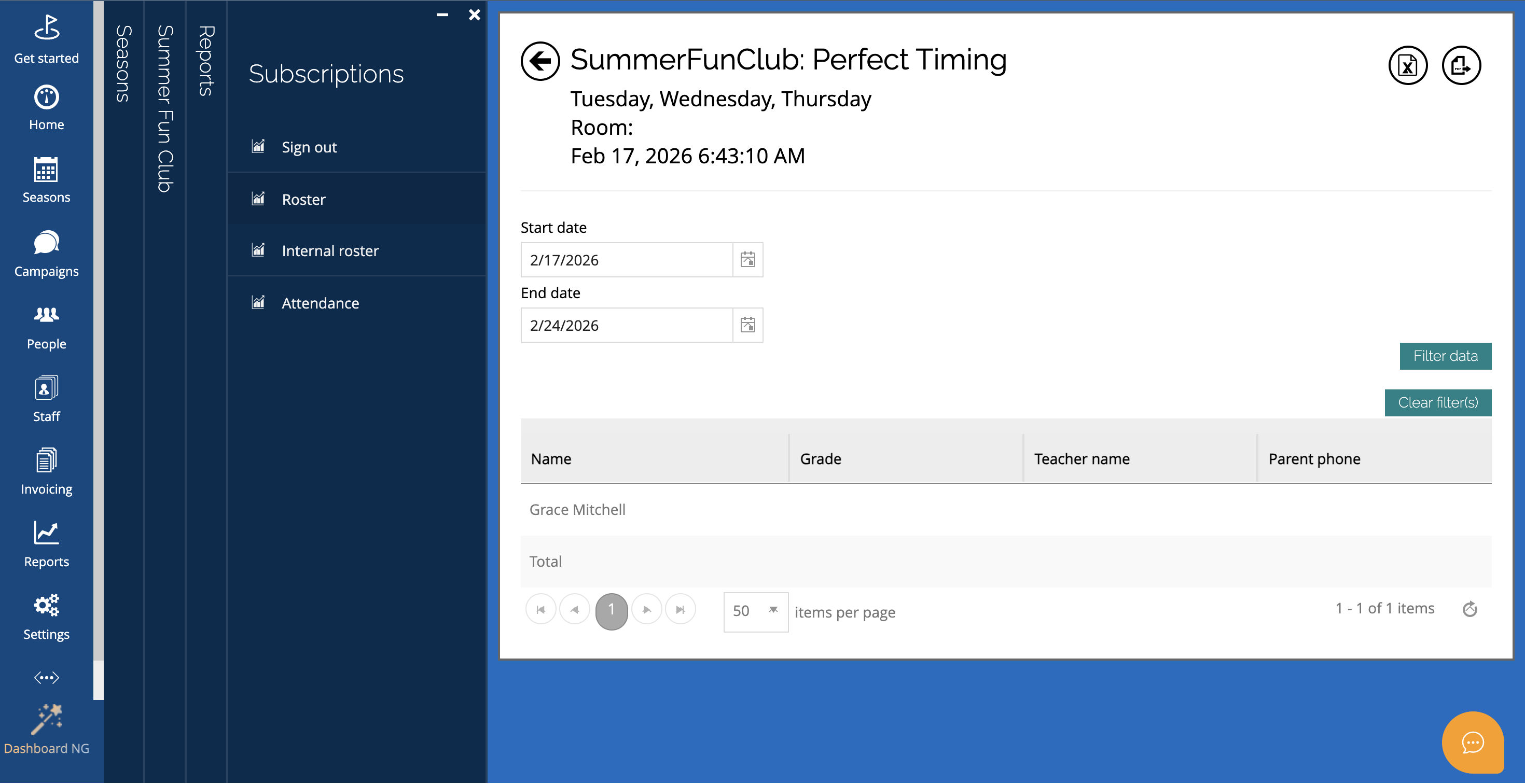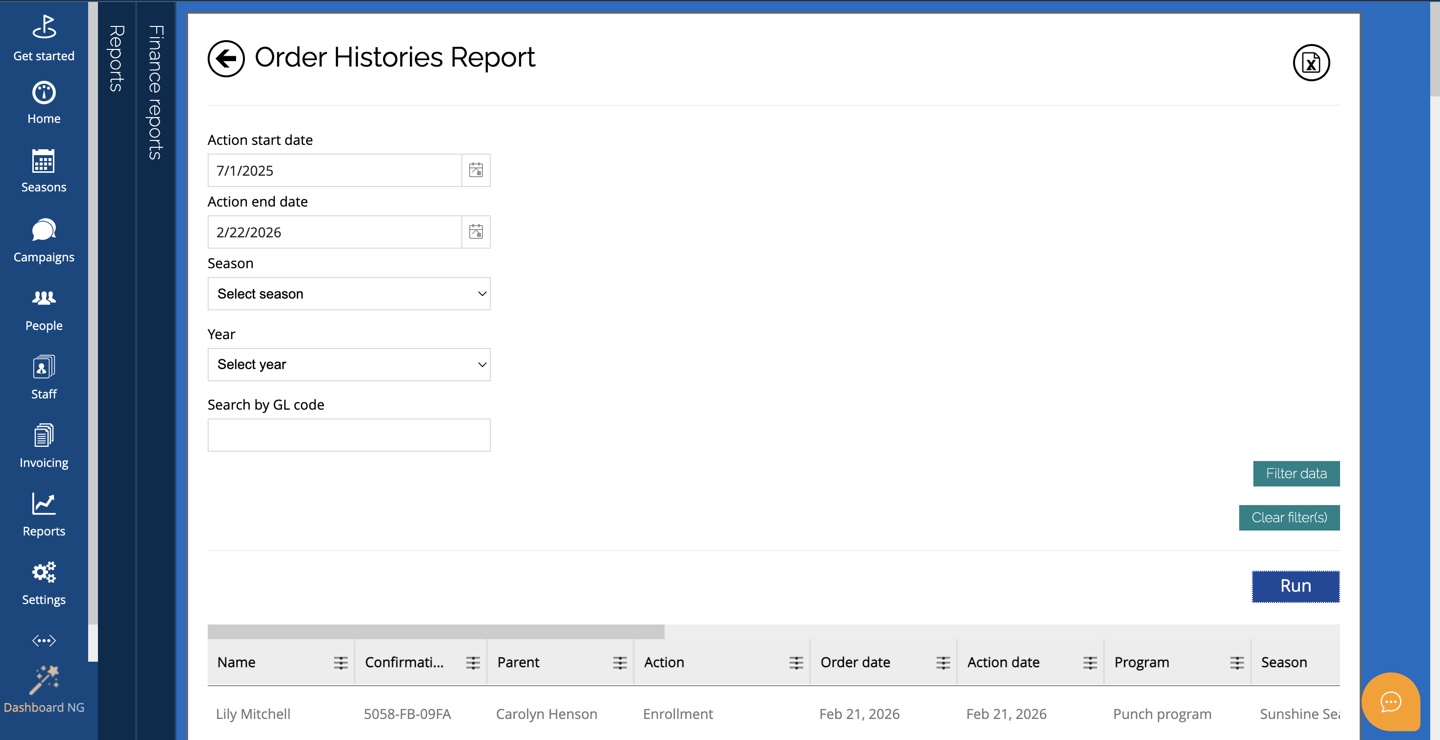 After your season is published and enrollments begin, you can monitor registrations, capacities, waitlists, and financial data using built-in reports and dashboards.