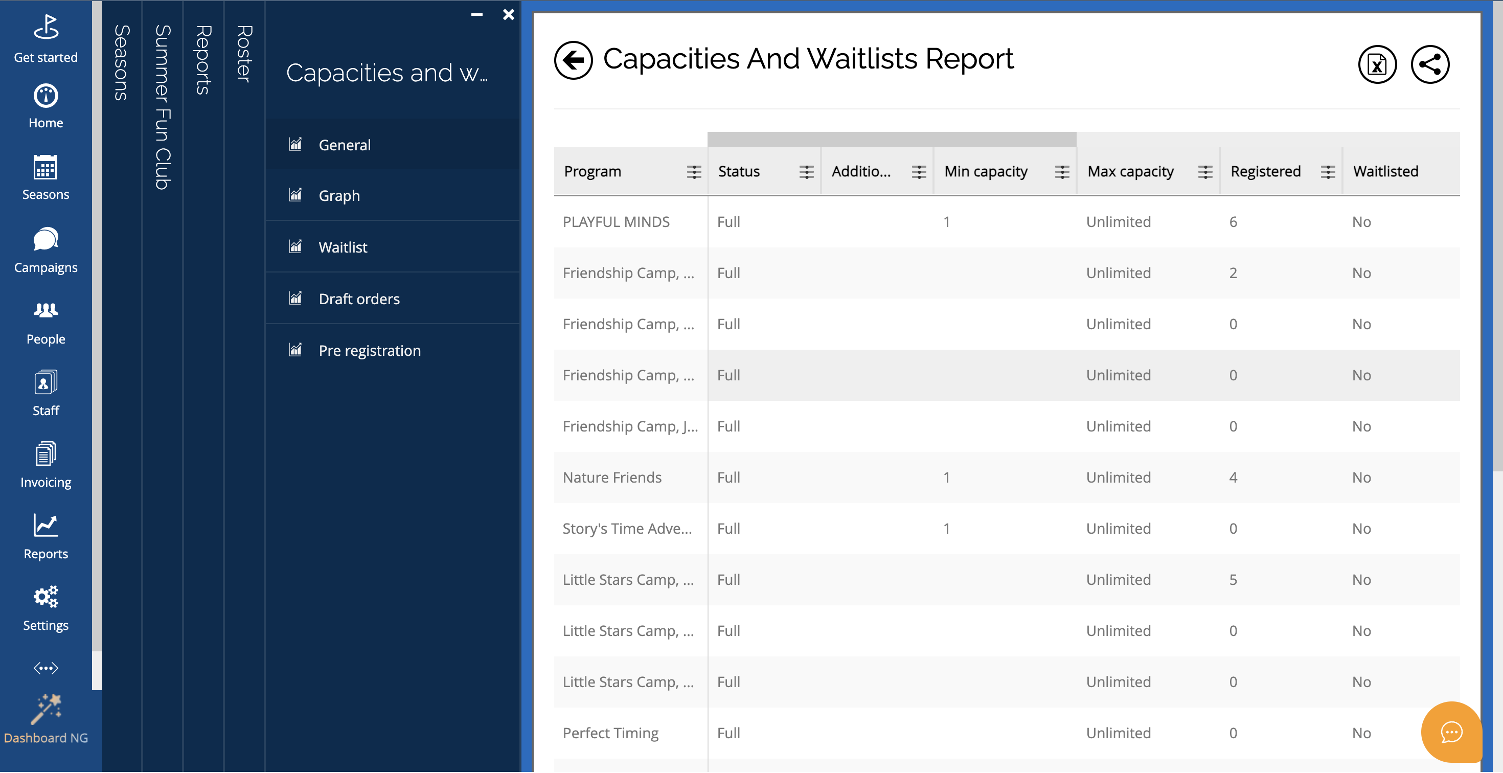 In the Capacity & Waitlist section, you can generate reports and review an overview of your programs, including waitlist status and overall capacity details.