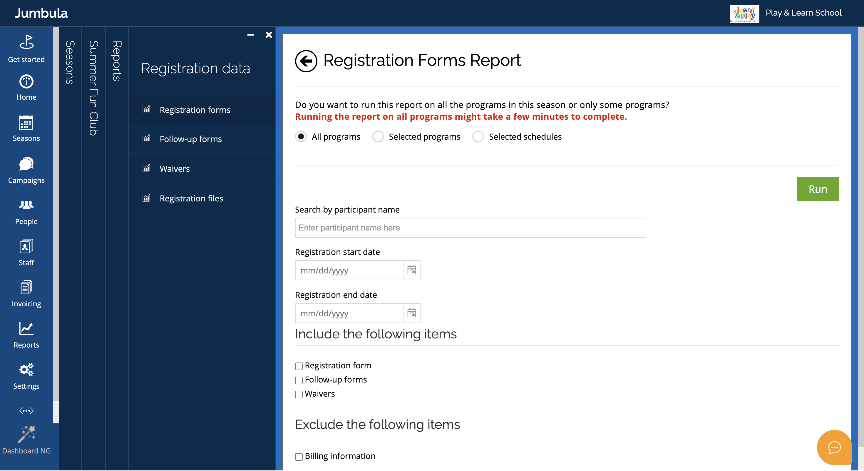 This section allows you to generate and export detailed reports that include registration data, waivers, and follow-up form responses. You can run reports for all programs within a season or select a specific program. Multiple filtering options are available to help you narrow down the data as needed.