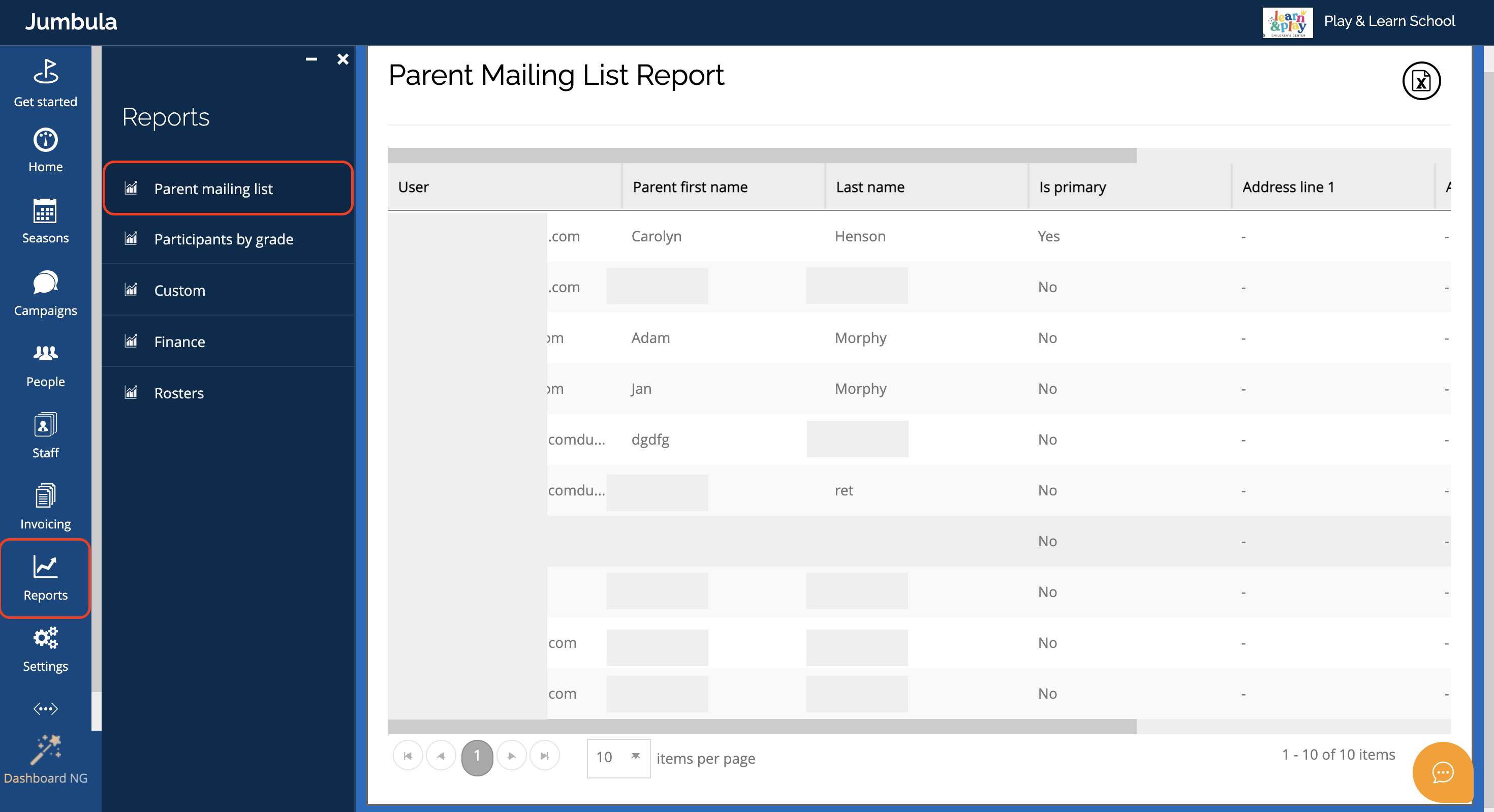 Here, you can view and export a complete list of parent email addresses, along with additional details—such as whether they are designated as the primary account holder.