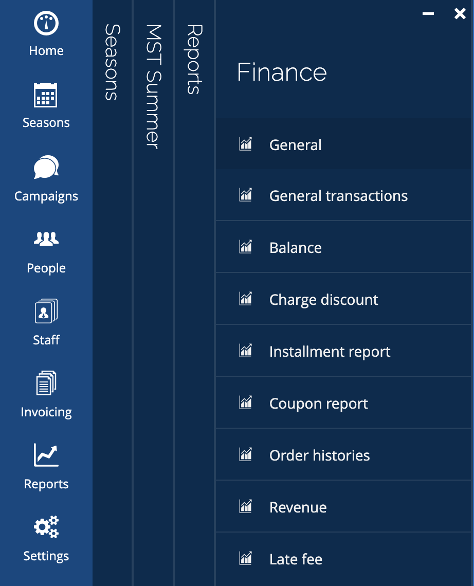 The Finance tab allows you to generate, export, and share multiple forms of reports: