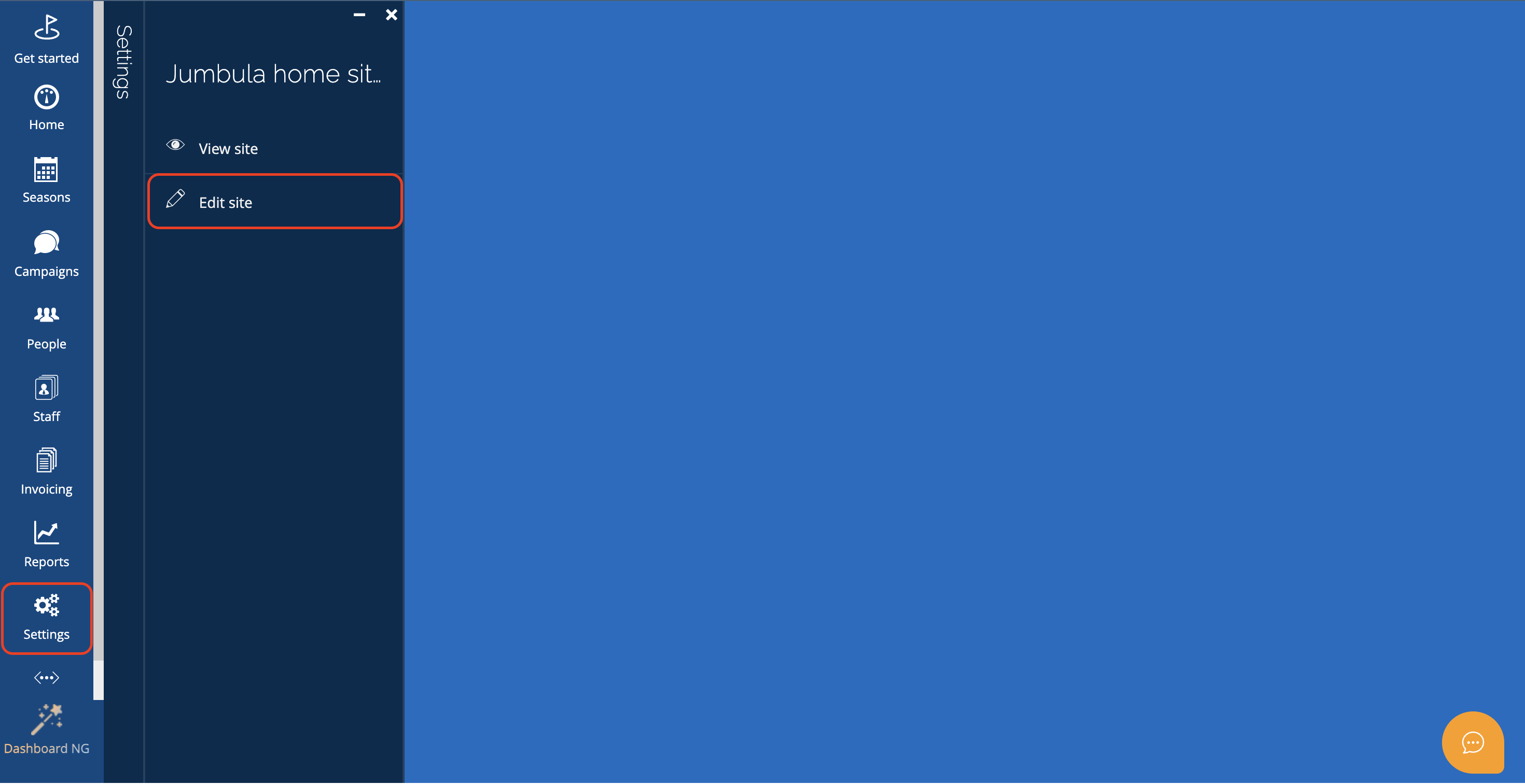 Navigate to Admin dashboard > Settings > Jumbula home site > Edit site.