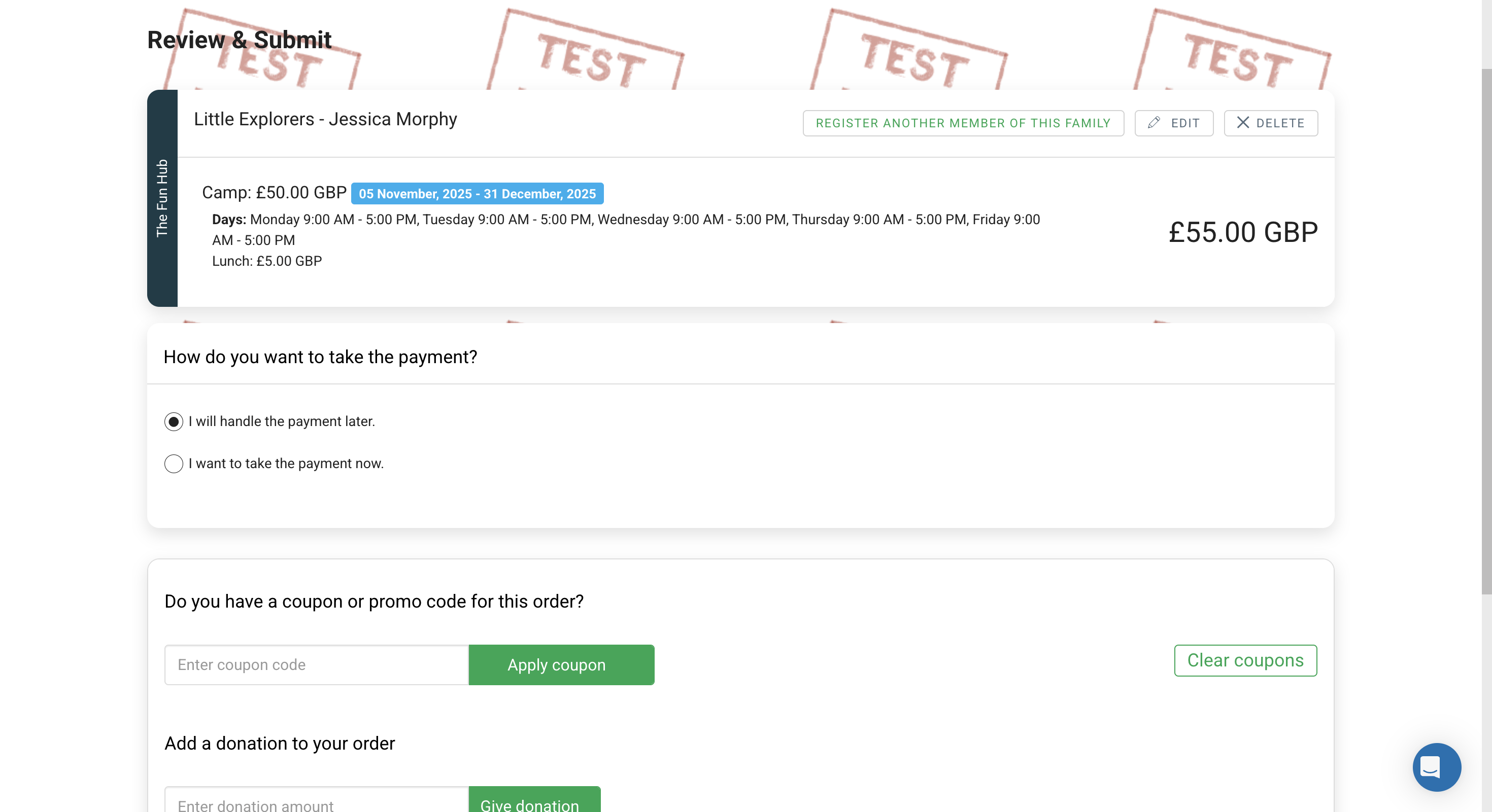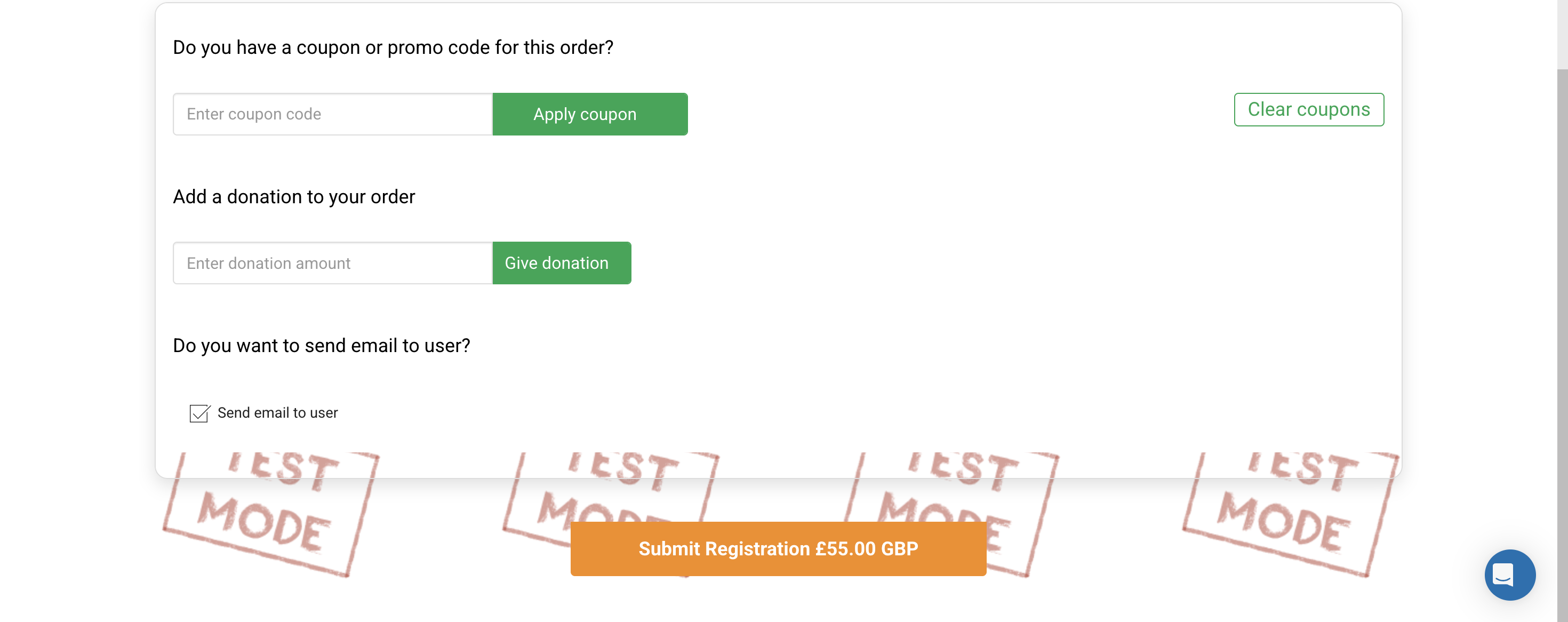 If you want to test coupons, donations, or other options, complete this section. When you’re finished, click Submit Registration.
