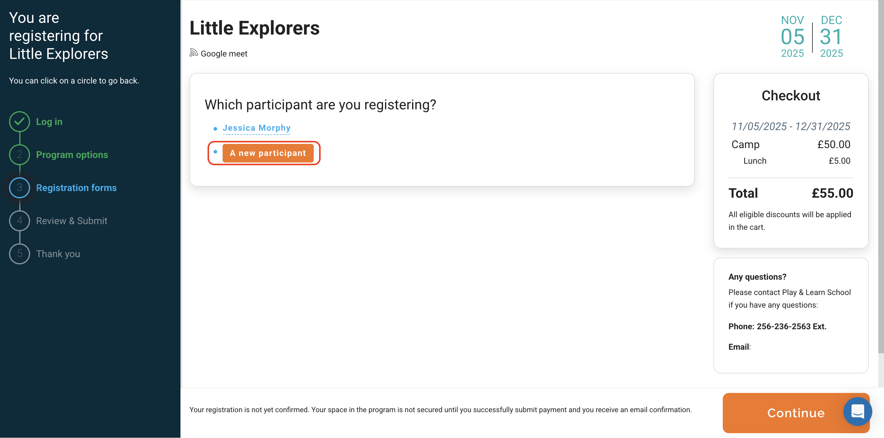 Your participants will land on this page and complete the registration form assigned to the program. If you’ve already created the participant, select their name from the list below. If not, create a new participant from scratch. Fill out the form and click Continue to proceed.