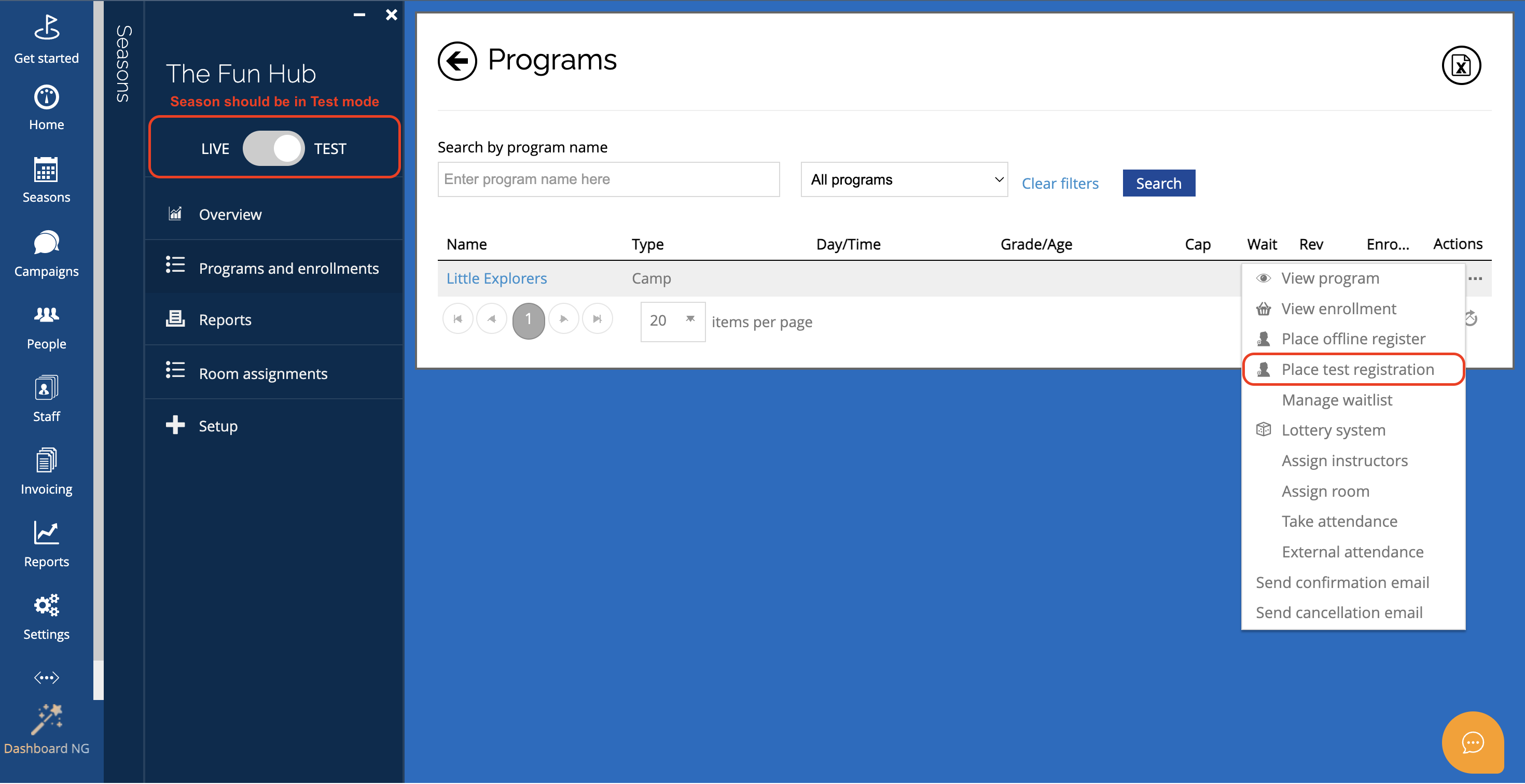 Go to Seasons > Your Season name > Programs and enrollments. Hover over the action menu and select Place test registration.