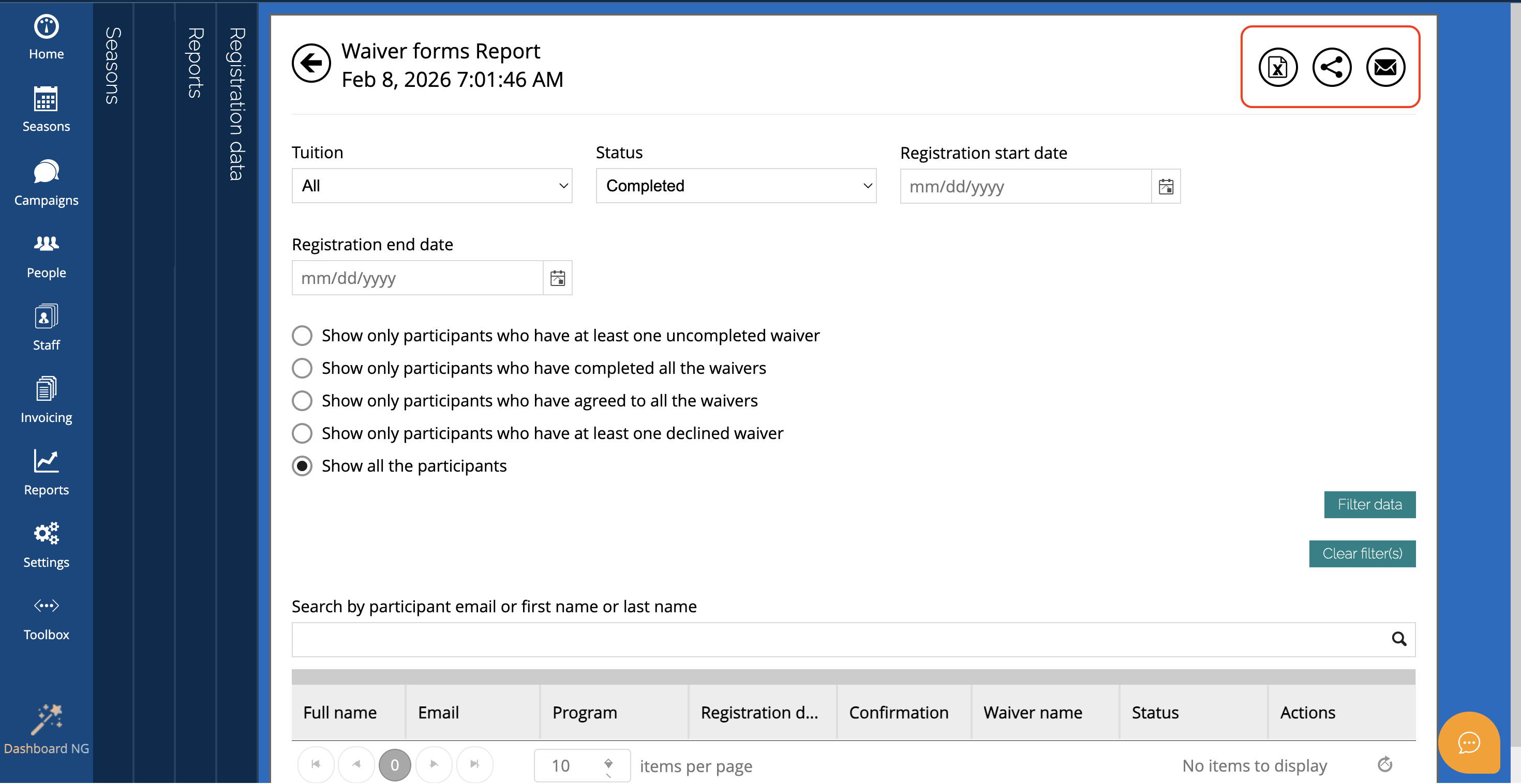 You can export the report by clicking the Excel icon, share it with staff using the Share icon, or email it to participants using the Email icon.