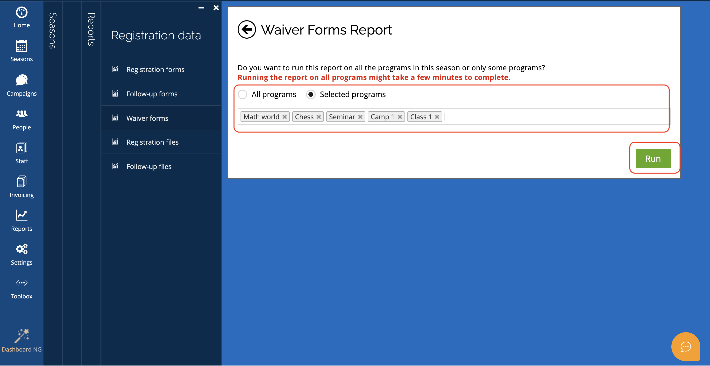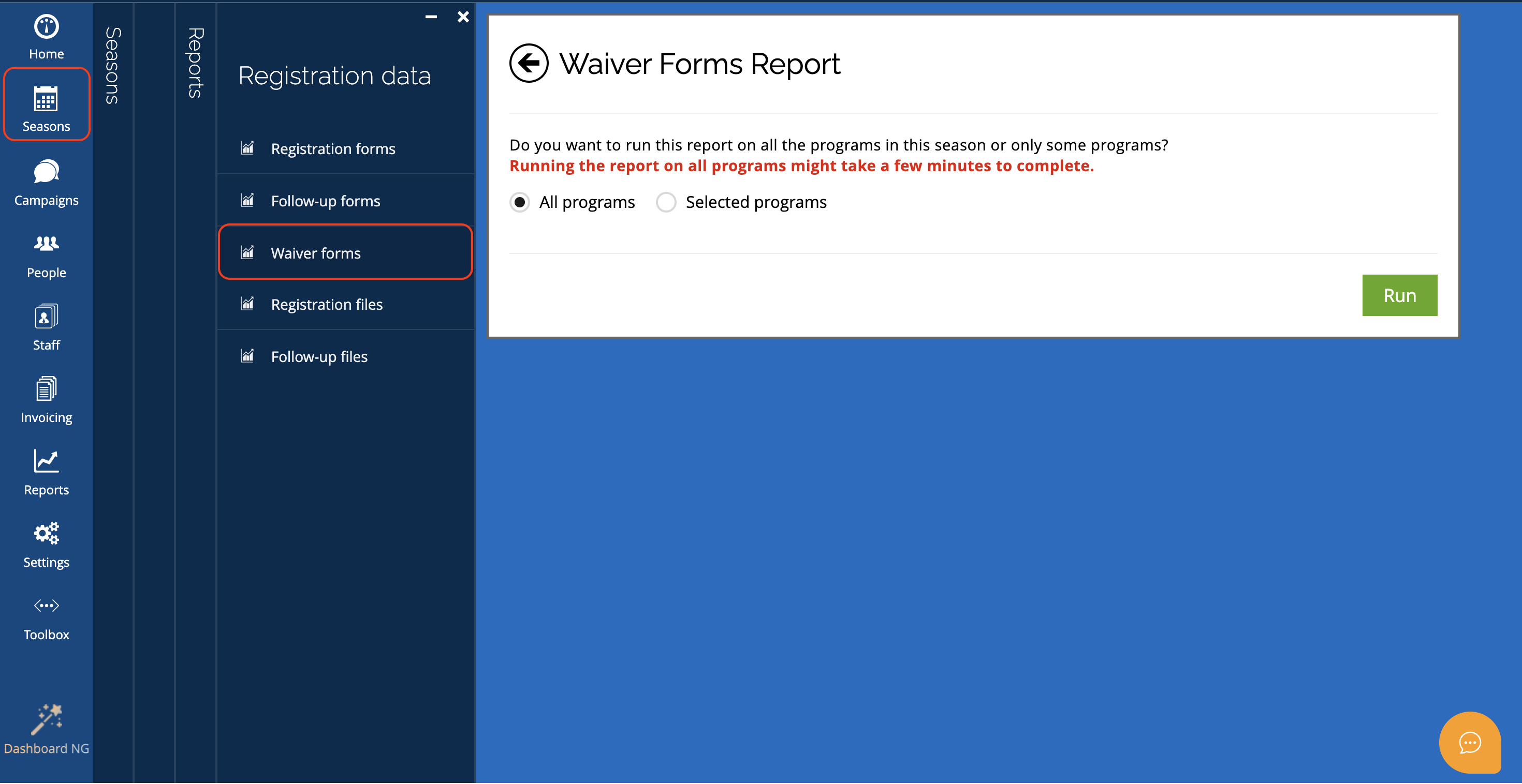 As you receive enrollments and collect waivers from participants, you can run a Waivers report to track waiver-related information across your programs. This report helps you review waiver statuses, search for specific participants, and export or share the data as needed.